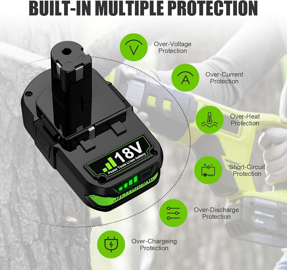 🔋 【Multiple Protection 】The battery replacement for ryobi 18v is multi-certified, tested, and validated by manufacturers to match the specifications of OEM products. Built-in High-quality cells that can protect against overcharge, over-discharge, over-current, over-voltage, and short circuit.