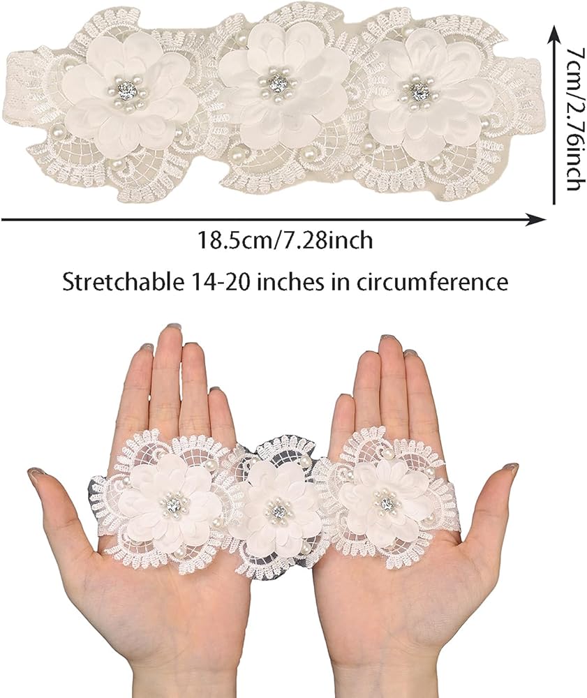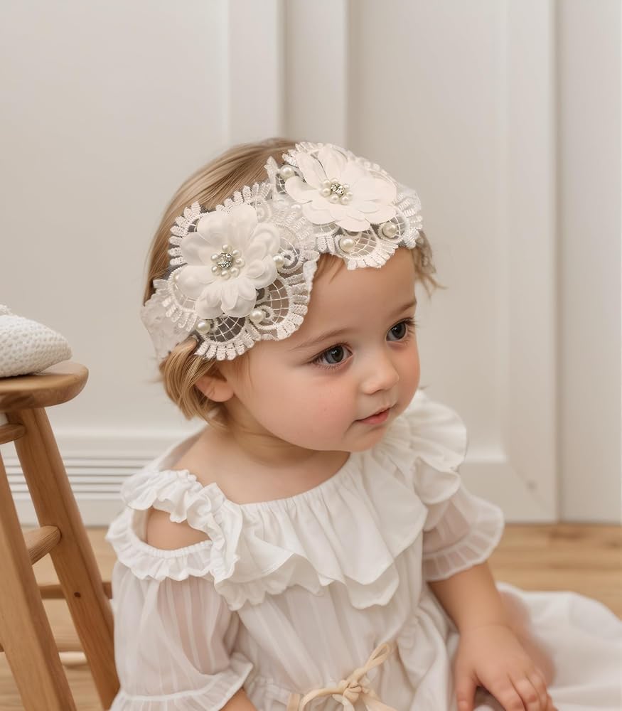 Elevate your little one's style with this adorable lace headband. Crafted from soft, stretchy fabric, it features an elegant lace design adorned with delicate, feminine flowers and pearl. Suitable for babies, infants, and toddlers aged 0-36 months, this headband offers a comfortable and secure fit while adding a touch of whimsy to any outfit. The elastic band gently hugs your child's head, ensuring it stays in place throughout playtime or special occasions. It is suitable for many occasions, such as weddings, parties, festivals, baby photography, daily wear, etc. It can accommodate a range of head sizes as your little one grows. Effortlessly elevate your baby's ensemble with this delightful hair accessory.
