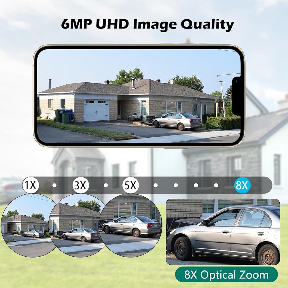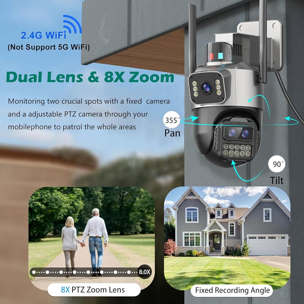 【8X Dual Lens PTZ Camera】Upgraded 8X PTZ camera offers UHD resolution, a fixed wide angle lens is focuse on the whole house, another 360° coverage 8X PTZ rotating lens can capture more detail in motion detection. Display them simultaneously on one screen with no blind spots, Excellent resolution make sure an superior day and advanced color night vision and capture more detail in the darkness within 30 feets. Not Battery Powered. "Wireless" means wireless wifi connect or NVR, Not 100% Free cord.