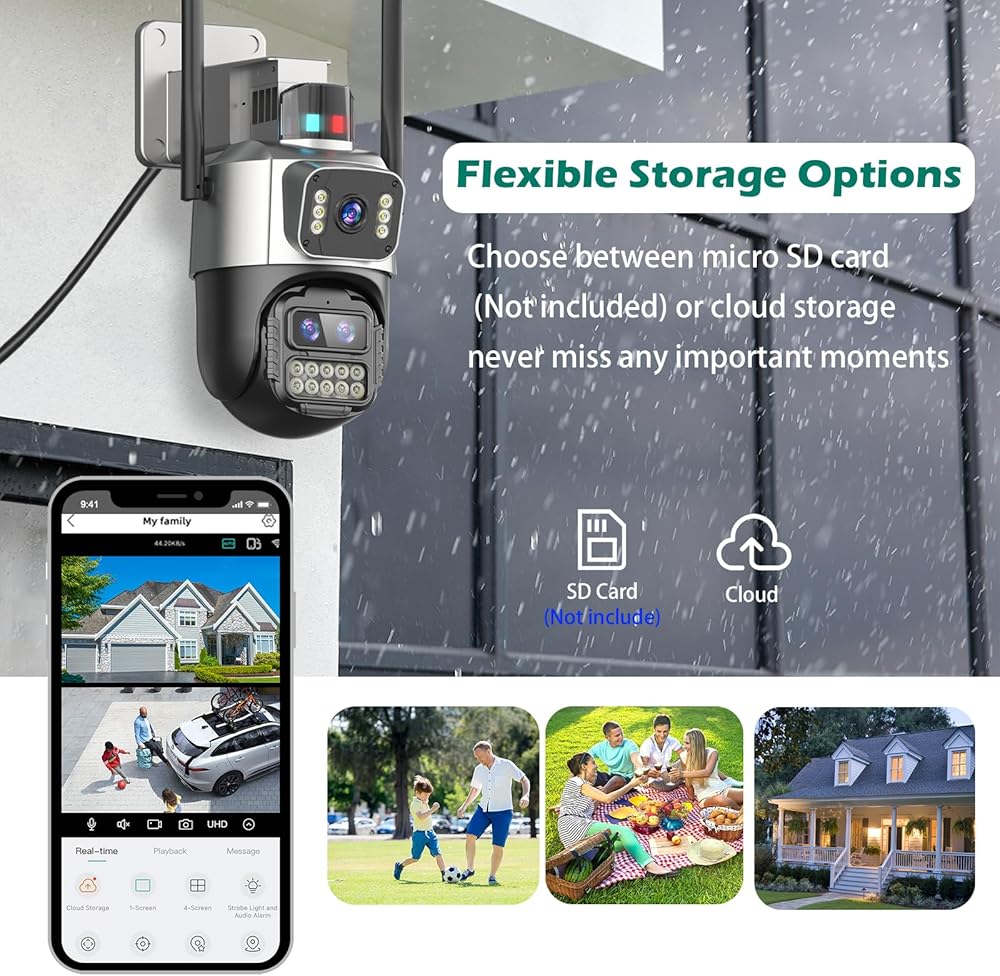 【2 in 1 Outdoor Cameras & IP66 Waterproof】 Dual lens outside camera can capture two areas simultaneously to record more detail in full view. 4MP 24/7 Recording motion camera provide is perfectly for more comprehensive protection for your outdoor and indoor safety. IP66 waterproof outside cameras is a good choice for use in rainy day, snowy day, and extreme weather. Use for Parking Lot camera, Warehouse cameras, outdoor/indoor.