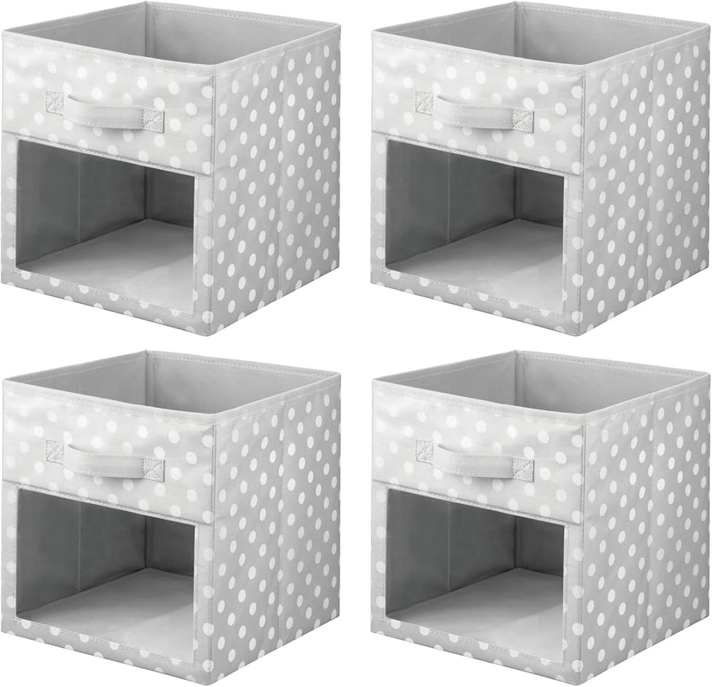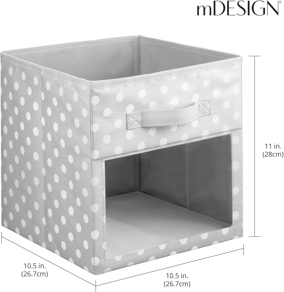 mDesign Fabric Nursery/Playroom Closet Storage Organizer Bin Box, Front Handle/Window for Cube Furniture Shelving Unit, Hold Toys, Clothes, Diapers, Bibs, 4 Pack, Gray/White Polka Dot