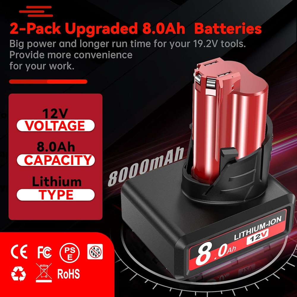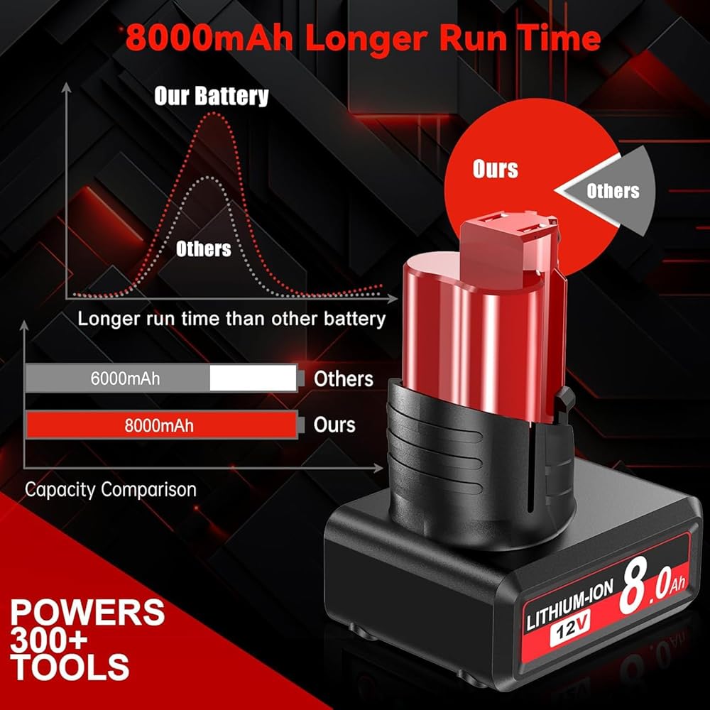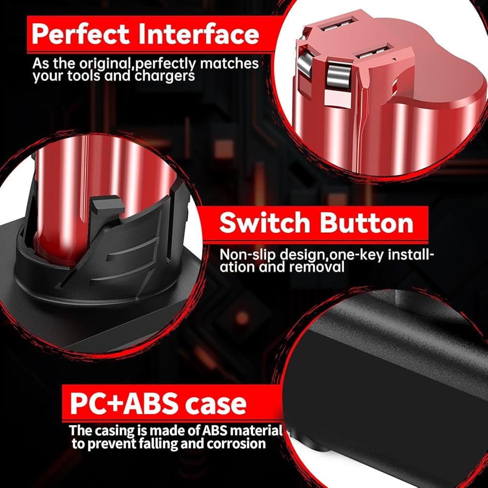 【Diverse Safety Protections】 The 12 volt battery for Milwaukee has built-in multiple protections: overcharging, over-discharge, over current, overvoltage, and short circuit protection, to ensure safety and extend battery life. The replacement battery upgrades the runtime and durability of your 12V cordless tools.