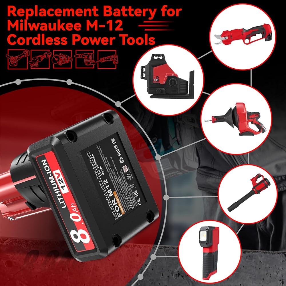 【Compatibility】The replacement for Milwaukee battery m12 100% works for Milwaukee lithium ion cordless tools and original charger. Replacement for Milwaukee 12V battery is compatible with Milwaukee 48-11-2401 48-11-2402 48-11-2411 48-11-2420 48-11-2440.