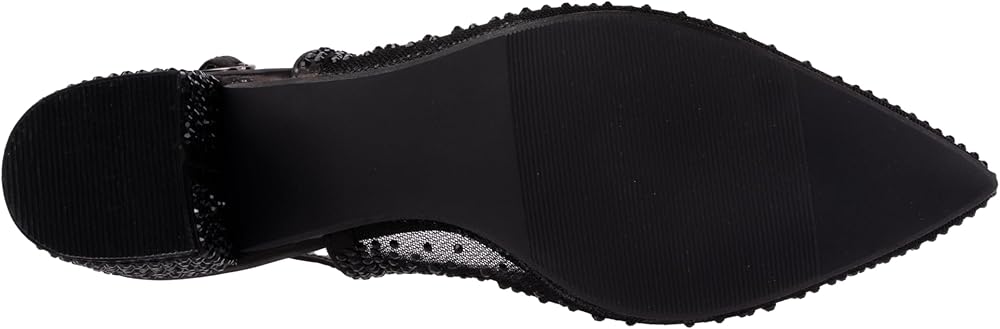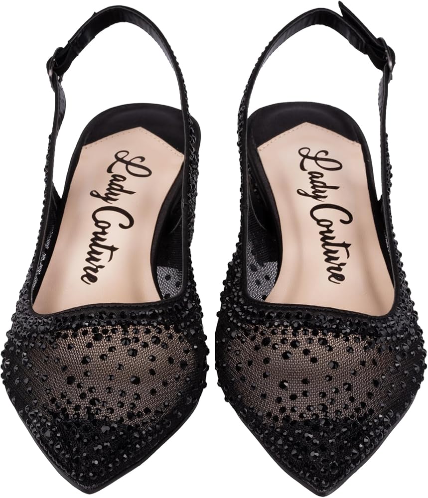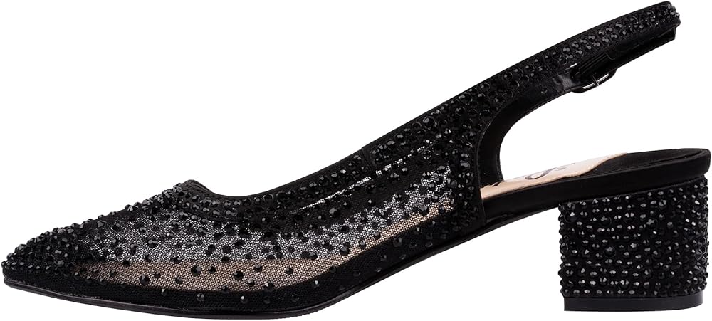 Scattered rhinestones on our translucent mesh slingback gives a delicate look to our sturdy buckle slingback. Low square block heel is embelished with rhinestones for your special occasion.