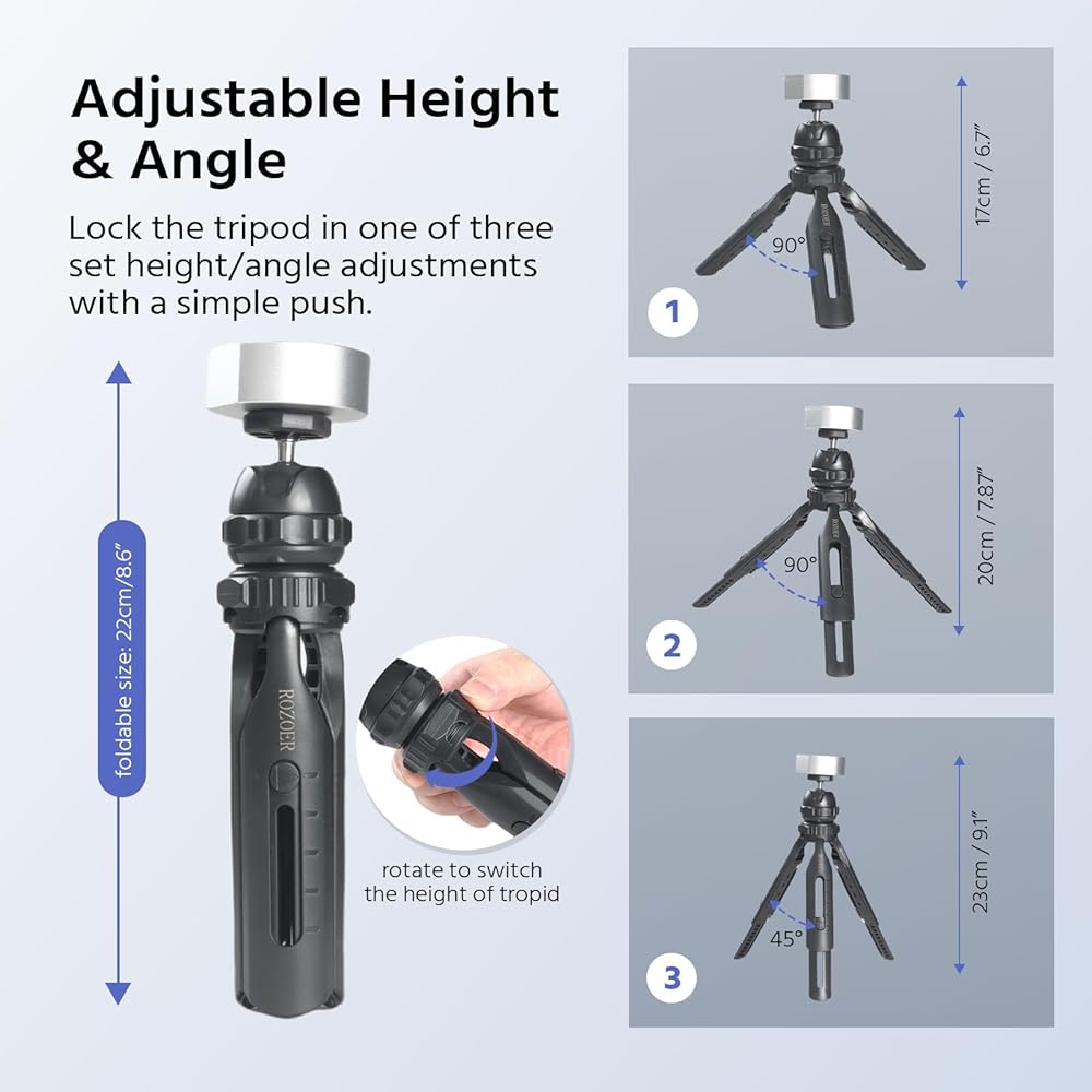 Height Adjustable: Customize to your comfort! The ROZOER Mini Tripod features an adjustable height mechanism, allowing you to find the perfect height for optimal viewing or capturing.