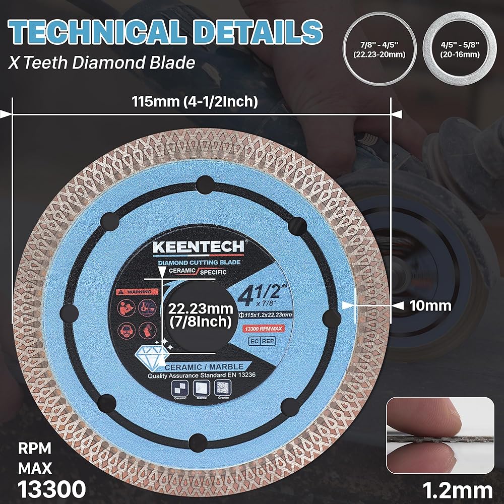 【Precise & Smooth Cutting】KEENTECH super thin diamond saw blades minimize the force required for cutting, while the X-teeth pattern ensures clean, burr-free cuts, making it perfect for precise tile cutting with minimal debris.