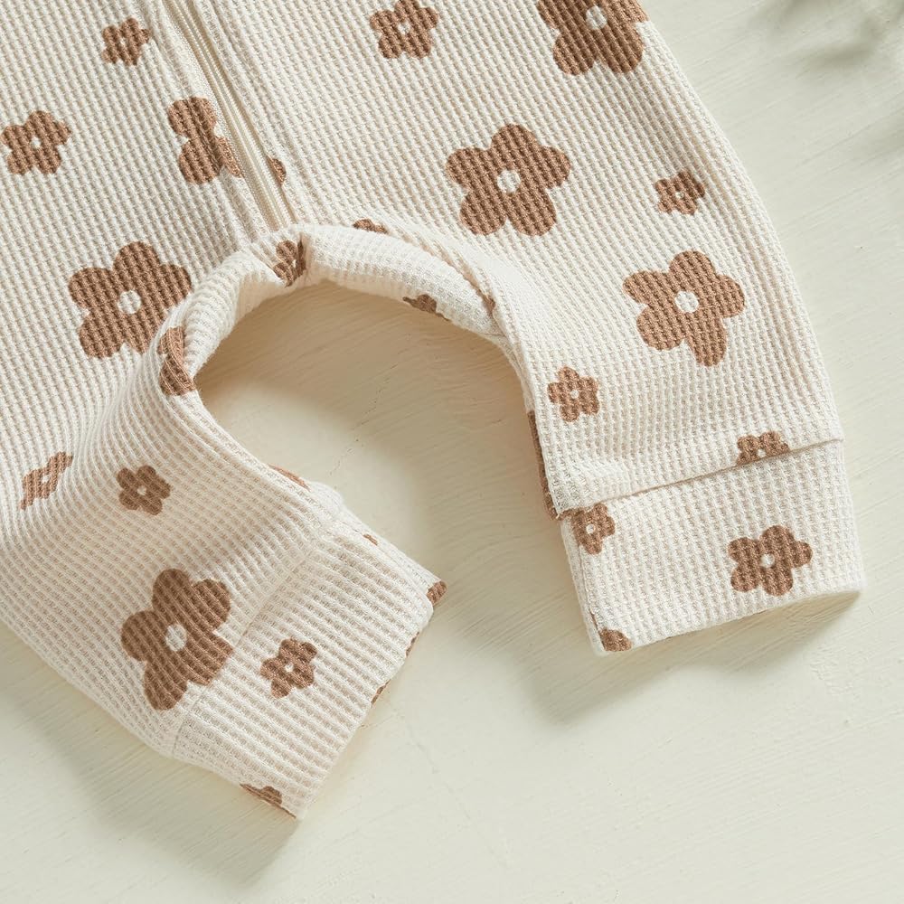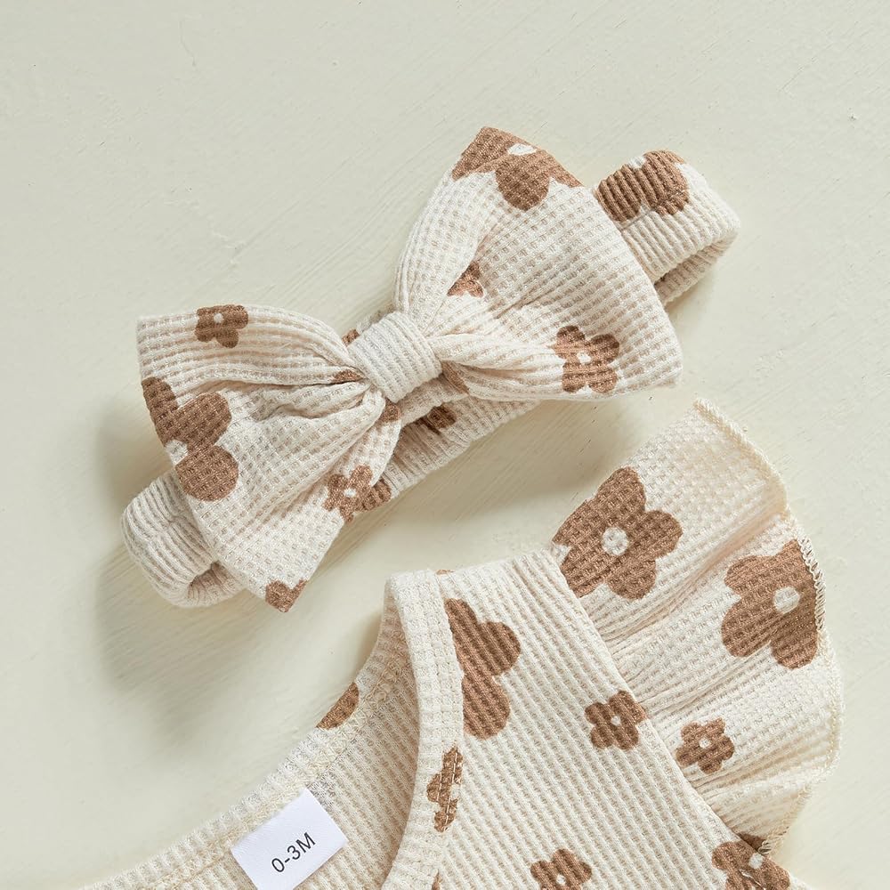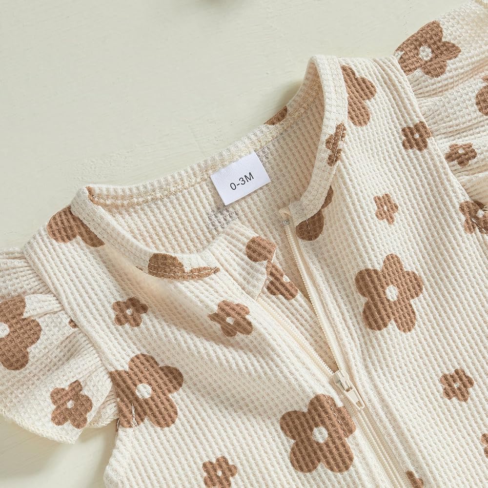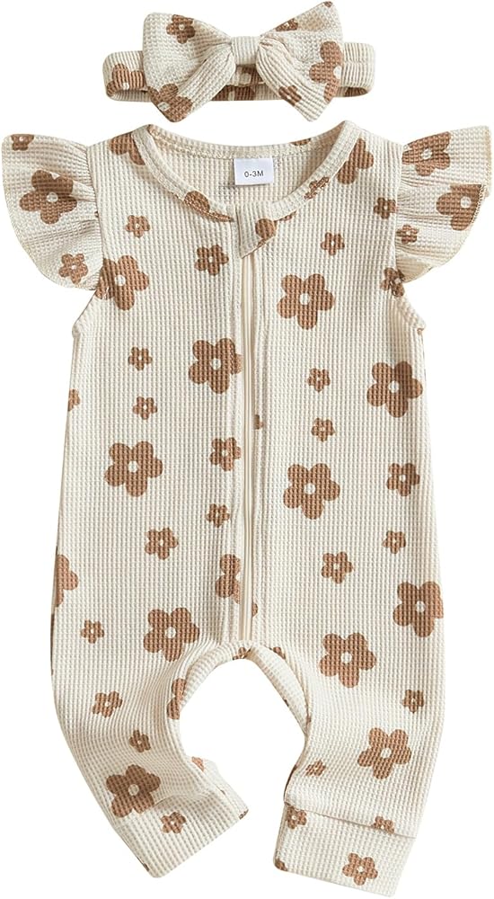 Baby Girls Summer Outfits Flower Pattern Crew Neck Flying Sleeve Zip Up Newborn Romper with Bow Headband 2 Pcs Set