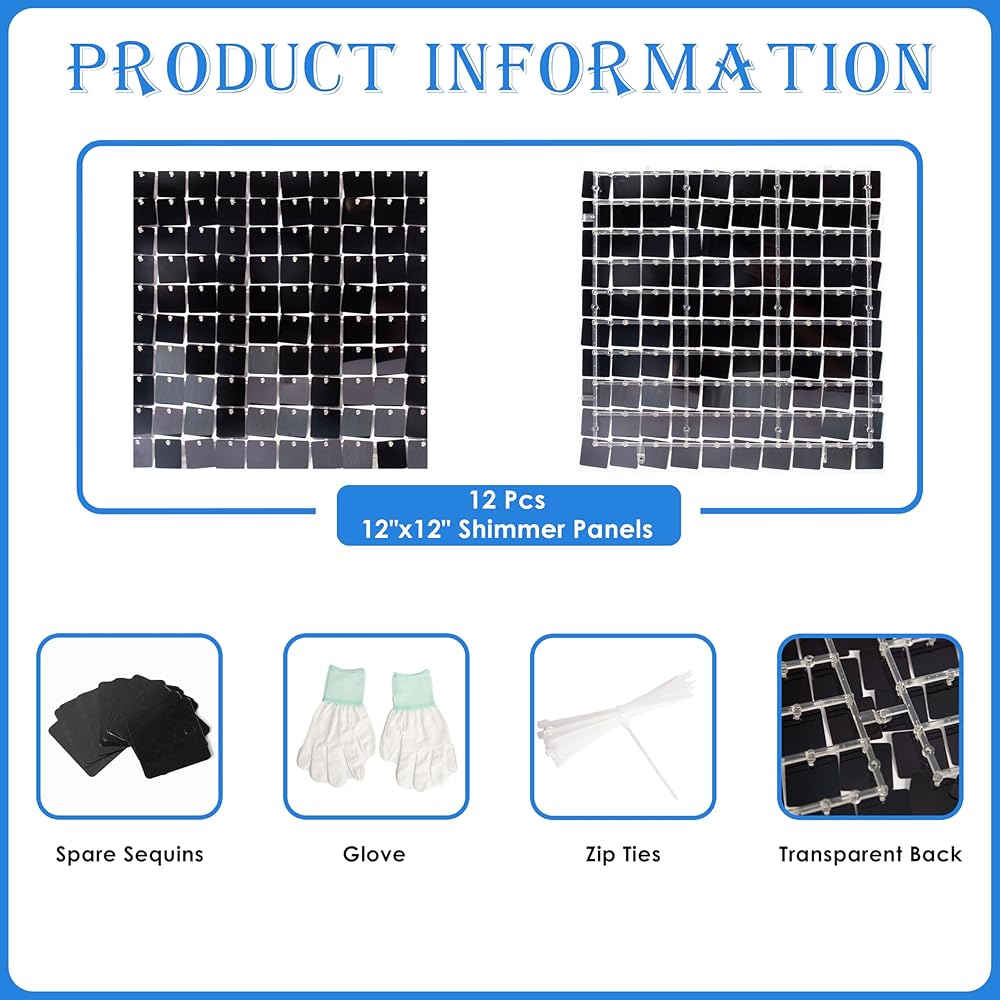 Package Includes: Each box comes with 36 pieces 12"x12" sequin panels and matching assembly materials, including gloves, zip ties and spare sequin pieces.