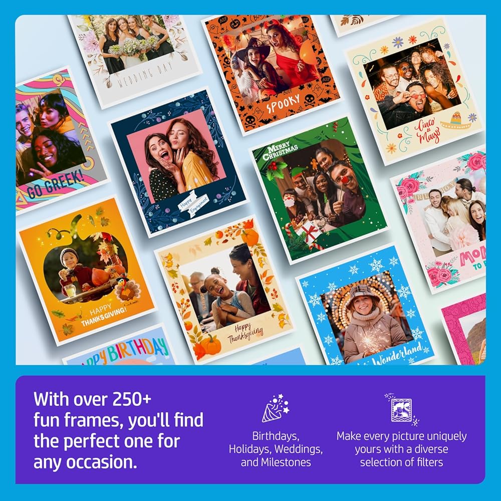 PORTABLE PHOTO FUN Weighing in at just over 8 pounds, it's easy to bring the photobooth fun to any event and immediately make it the life of the party. With 250+ fun frames and stickers to choose from for every occasion, you're sure to find the perfect ones to take any event to the next level.