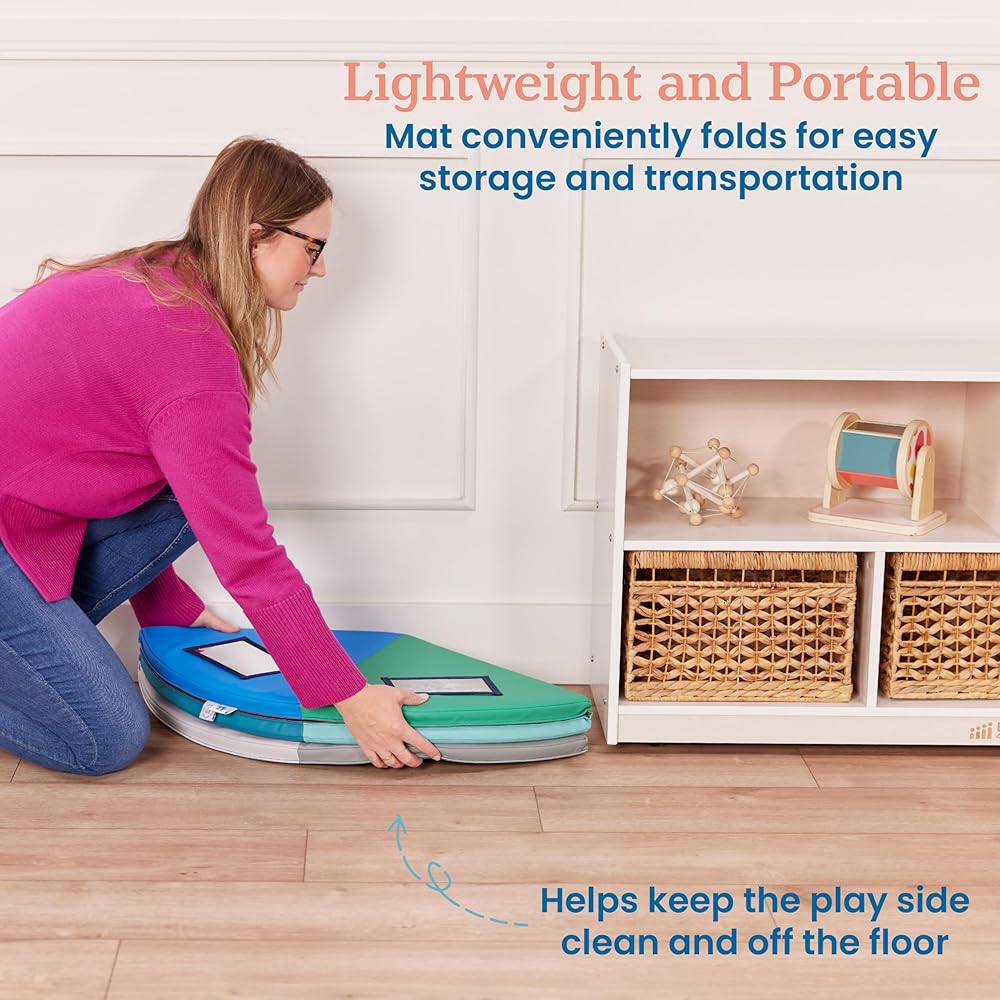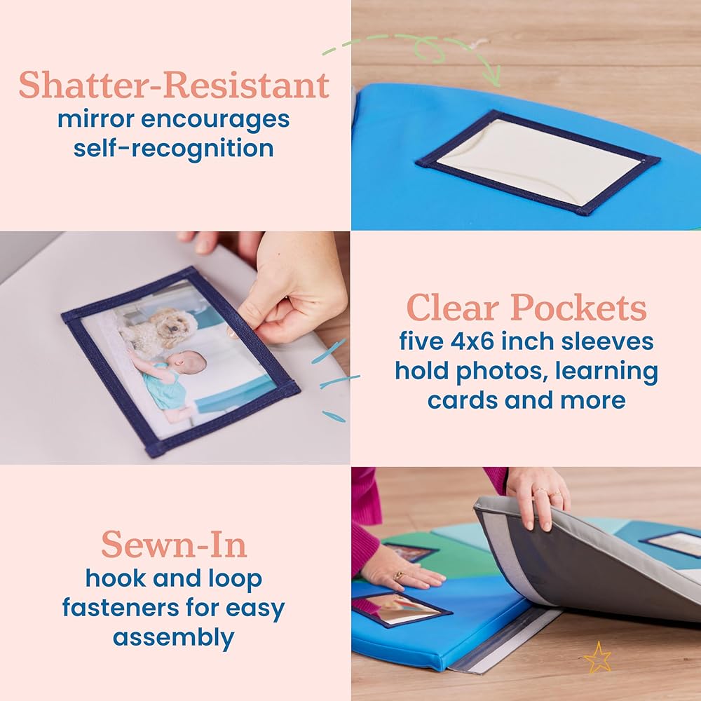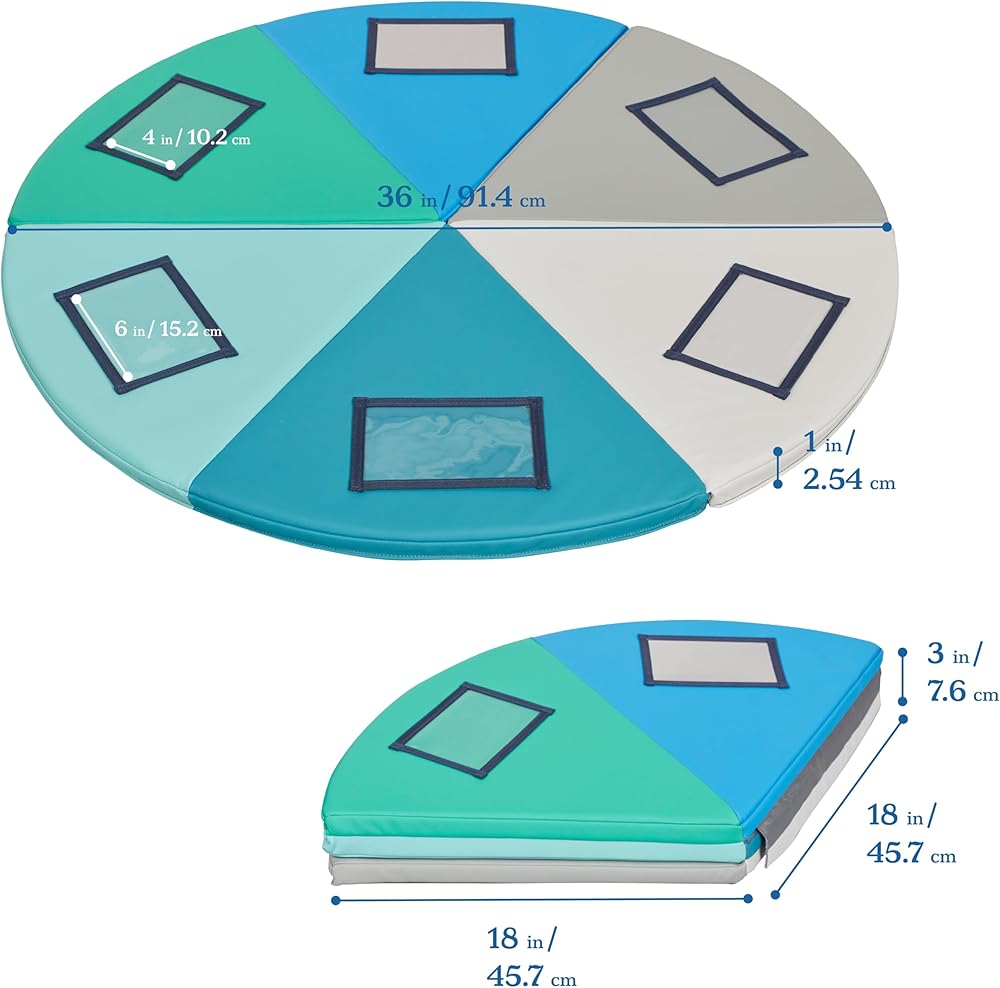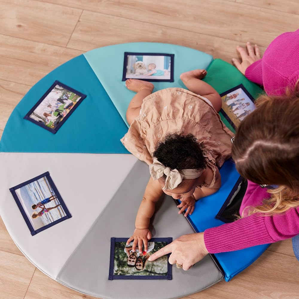 Spark curiosity and learning with the ECR4Kids SoftZone Picture Me Play Mat, designed to engage little ones in sensory exploration and self-awareness. Ideal for daycare, preschool, or home use, this play mat provides a cozy space for tummy time and evolves into an interactive play zone for toddlers. The playroom mat features six colorful panels with five 4x6 clear pockets allowing parents, teachers, and educators to rotate images, providing babies with visual stimulation that supports recognition and familiarity. Use photos and flashcards to introduce vocabulary and familiar faces, aiding early language skills. Babies are encouraged to reach, crawl, and touch the floor mat, building strength and coordination for gross motor skills. A shatter-resistant acrylic mirror encourages self-observation, fostering self-awareness. Using the circular mat for tummy time and crawling helps strengthen neck, shoulder, and core muscles which is excellent for the development of gross motor skills. As children play together, they develop social skills like communication, cooperation, and sharing. The foam core is covered with water-resistant polyurethane vegan leather with a durable woven backing and features a non-slip base for added stability. Pair the infant floor mat with additional classroom must-haves, like ECR4Kids SoftZone® Picture Me Soft Blocks, sold separately.