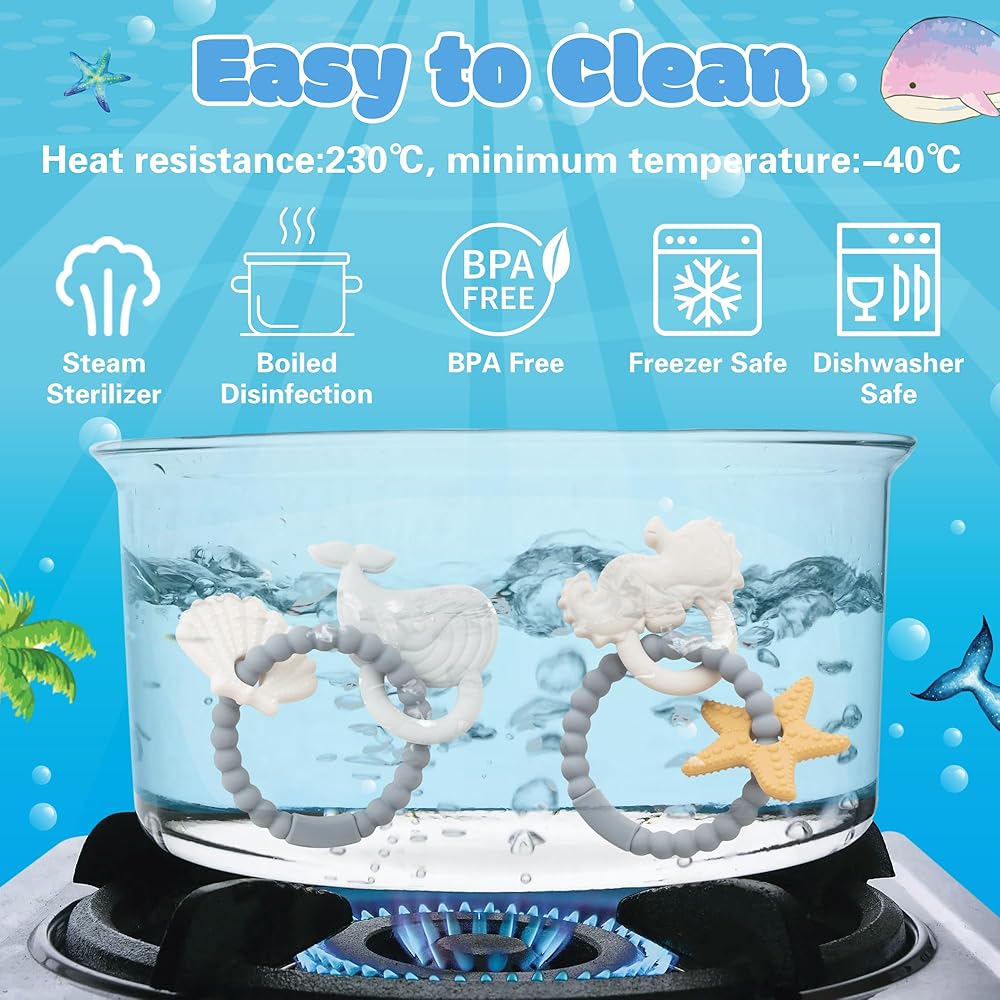 EASY TO CLEAN: Before using our teething toys, we recommend sterilizing them in boiling water for 2-3 minutes. After each use, they can be easily cleaned in the dishwasher or with warm soapy water. Our Easter silicone teething toys are heat resistant from -40°C to 230°C and can be boiled, autoclaved or refrigerated so you can use them with confidence and wash them easily.