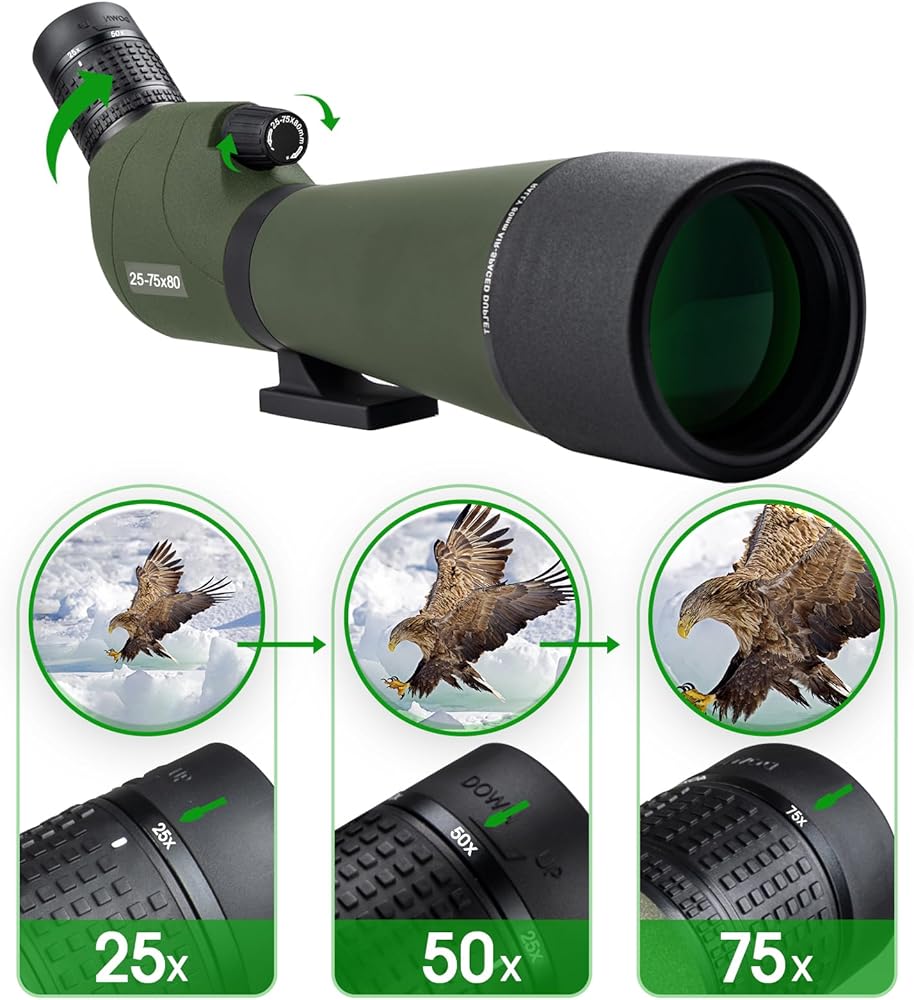 25-75x80 Spotting Scope for Target Shooting Spotter Scope with Tripod Phone Adapter Carrying Bag BAK4 Monocular Telescope for Hunting Birdwatching Green