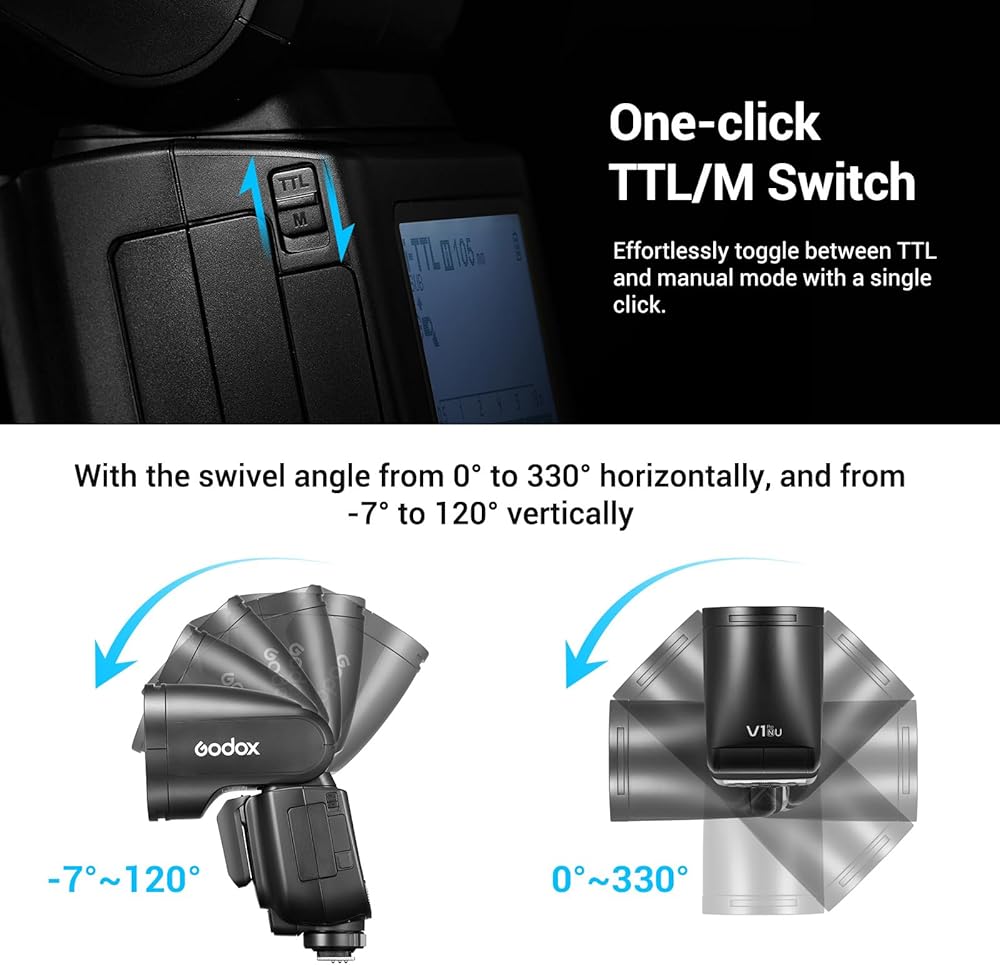 One-Click TTL/M Switch: V1Pro-NU can quickly switch between TTL automatic flash mode and M manual flash mode by one-click, saying goodbye to tedious operation and flexibly adapting to various scenes