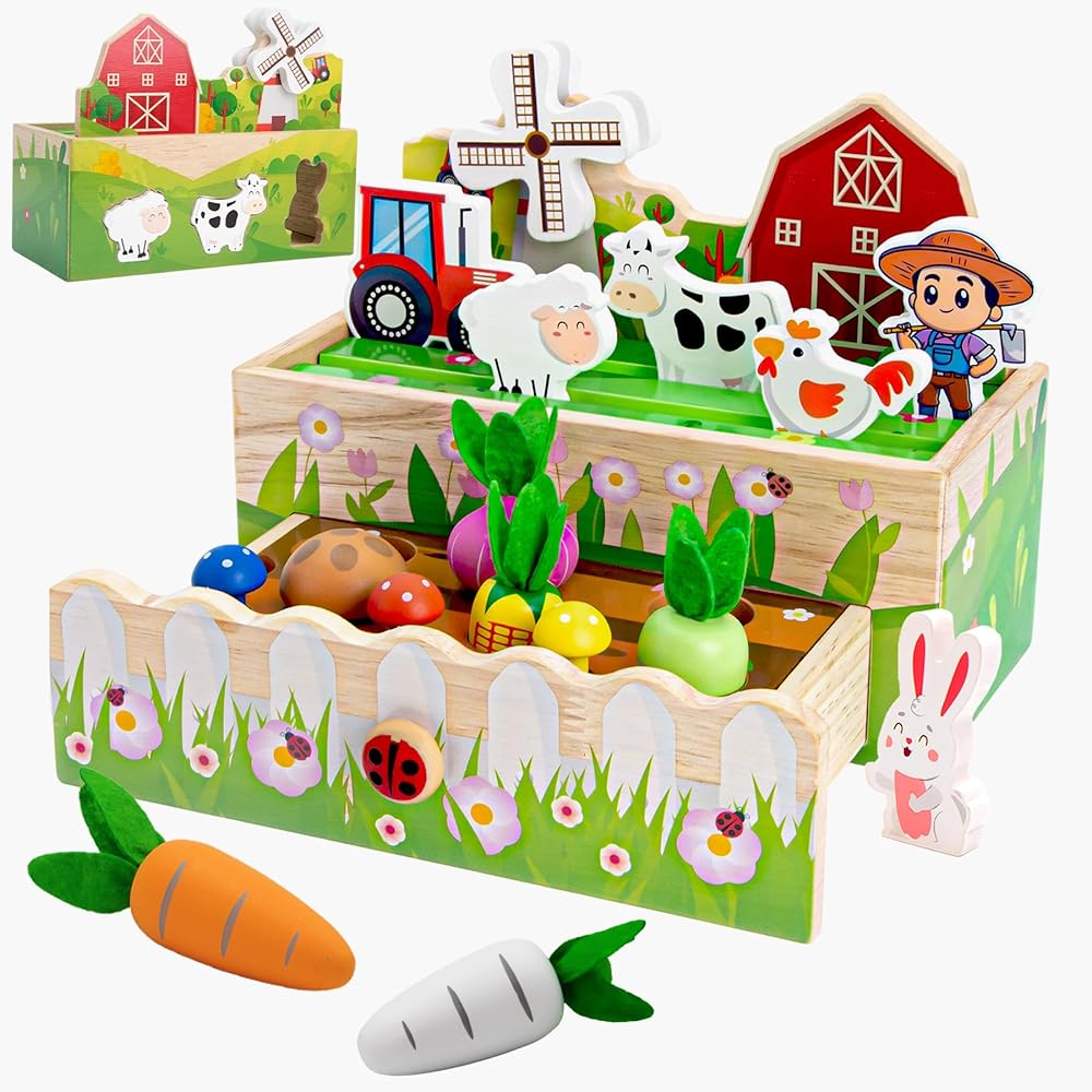 Montessori Toys for 1+ Year Old: The delightful wooden farm toy features an array of engaging games. Toddlers can have a great time pulling vegetables, using the boy farmer to catch worms, placing vegetables in their corresponding color-coded positions, matching animal shapes, playing exciting map games, spinning gears, and pulling the wooden toy. These activities will not only challenge your child but also provide long-lasting entertainment