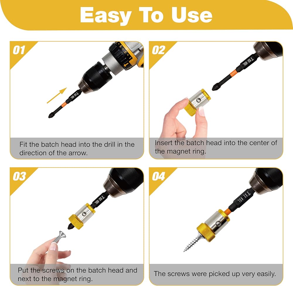 【Usage Steps】Select the appropriate bit and secure it in the drill chuck. Install the magnetic screw ring on the bit, making sure it is close to the tip. Place the screw on the bit, the magnet will automatically attract, and then start the drill to drill or tighten.