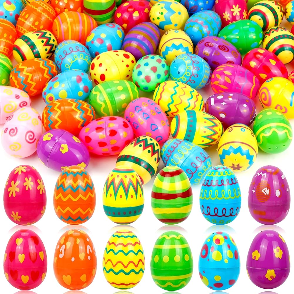 🐣【Reusable】Each egg measures 2.3" Tall x 1.5” wide. The colorful plastic egg is divided into two parts, You can easily open with a slight twist. You can fill the empty eggs with candy, toys, stickers and other small items, and then align the upper and lower parts to make them tightly closed together. Each egg is reusable.