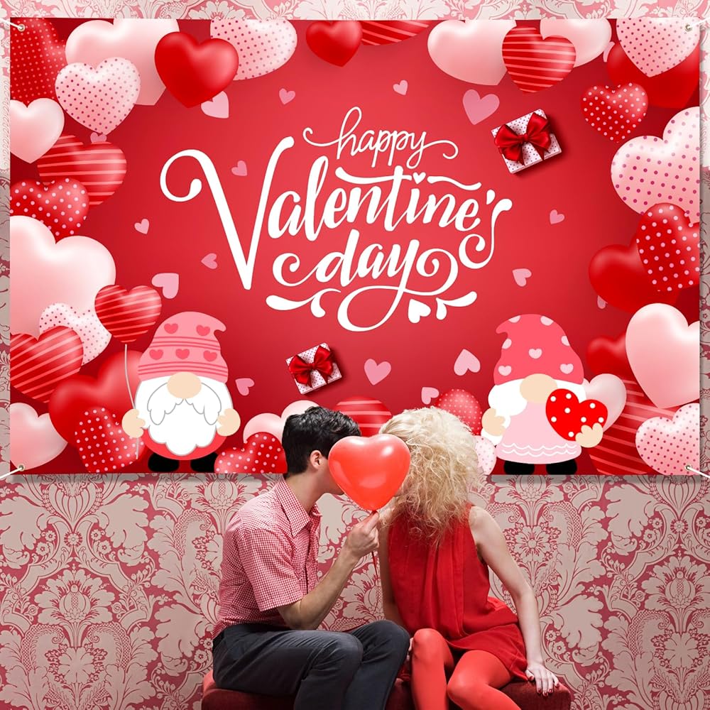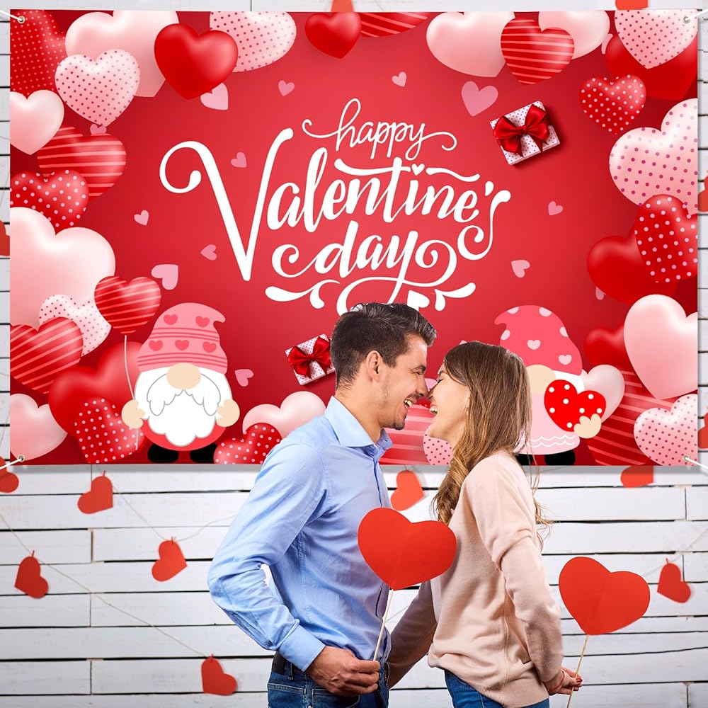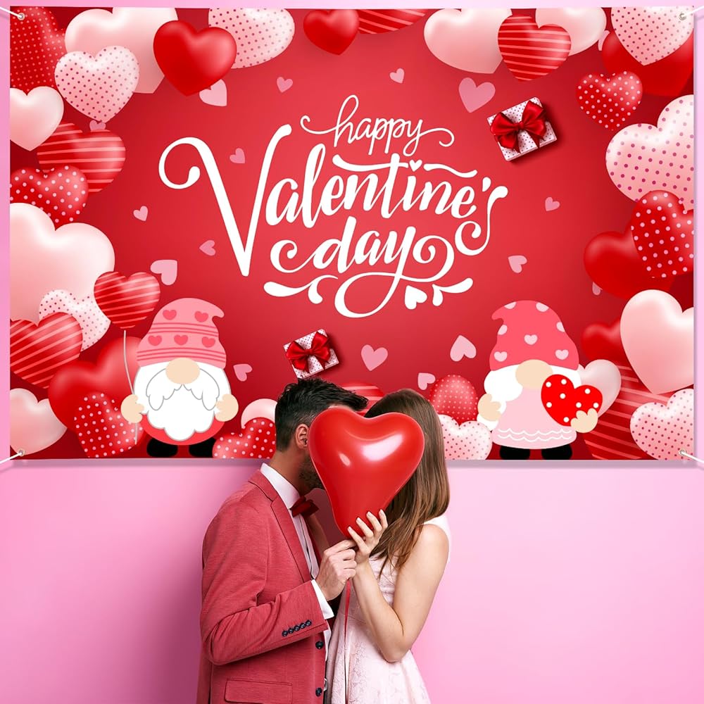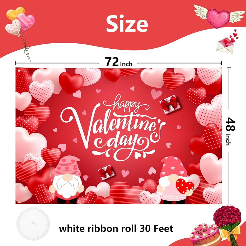 Large Valentines Day Banner 72" x 48" Decorations Happy Valentine's Day Banner Romantic Hearts Gnomes Party Supplies Photography Background for Indoor Outdoor Garden,Yard,Party Home Decor