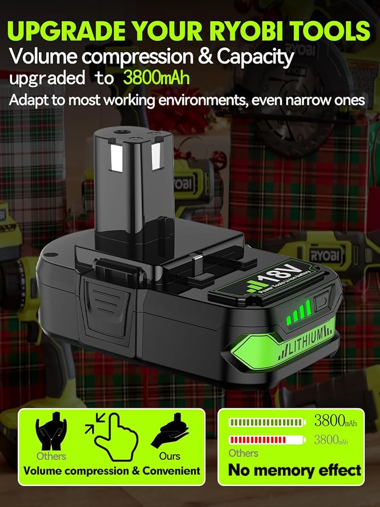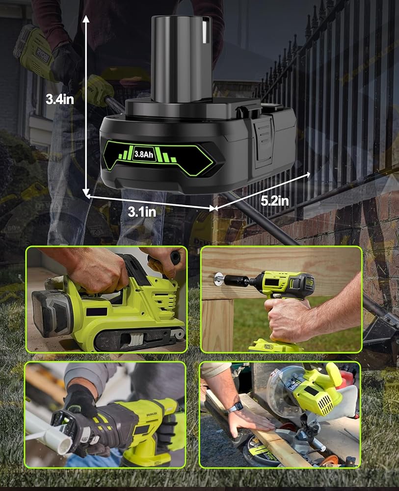 [UPGRADE YOUR RYOBI TOOLS] The battery life and usage time are improved. While maintaining its lightweight, the battery capacity has been upgraded to 3800 mAh, allowing you to use the tool more flexibly and Adopt more durable battery core,the upgraded battery core allows your tools to be used longer and you can complete your work faster!