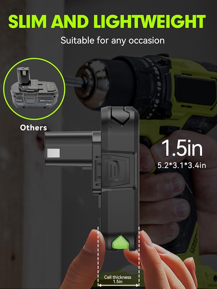 [EASY TO INSTALL AND USE] According to ryobi tool base test, it can be installed very easily and remove the battery from your power tool, just slide the battery into the tool, slide out the battery by pressing the release button. And by pressing the indicator light button, you can check the remaining battery power and charge the battery in time, so the work schedule can always be controlled within the planned range.