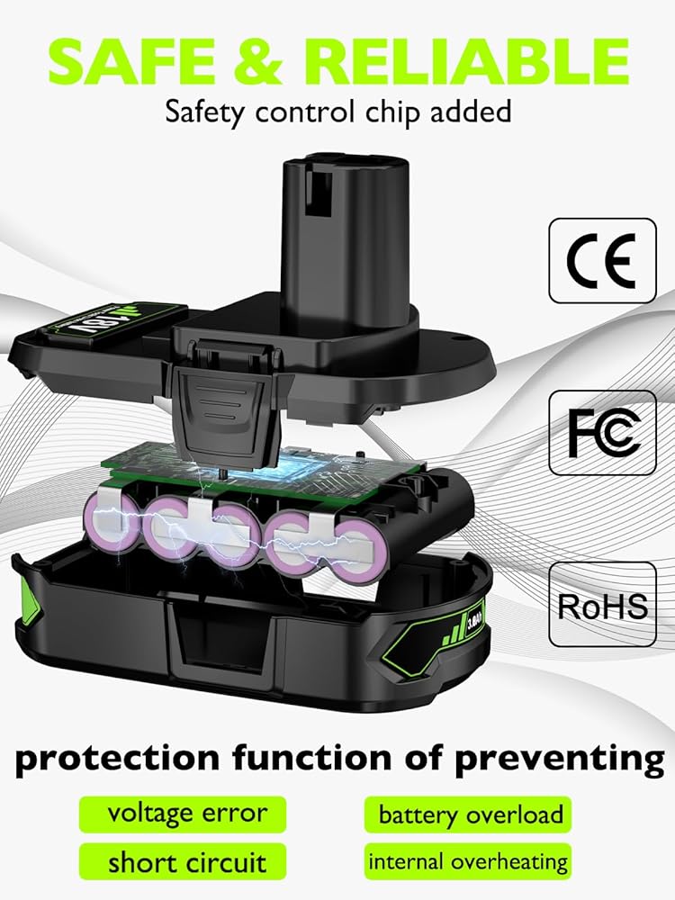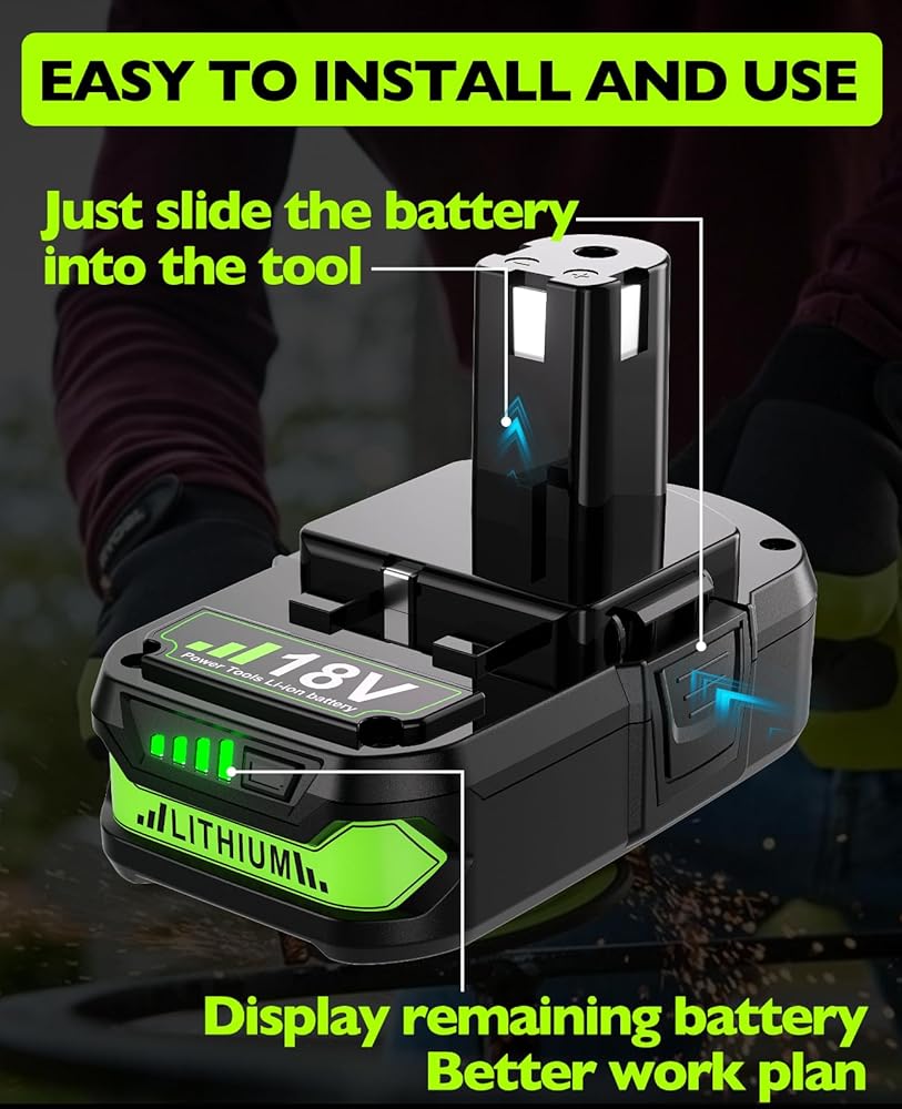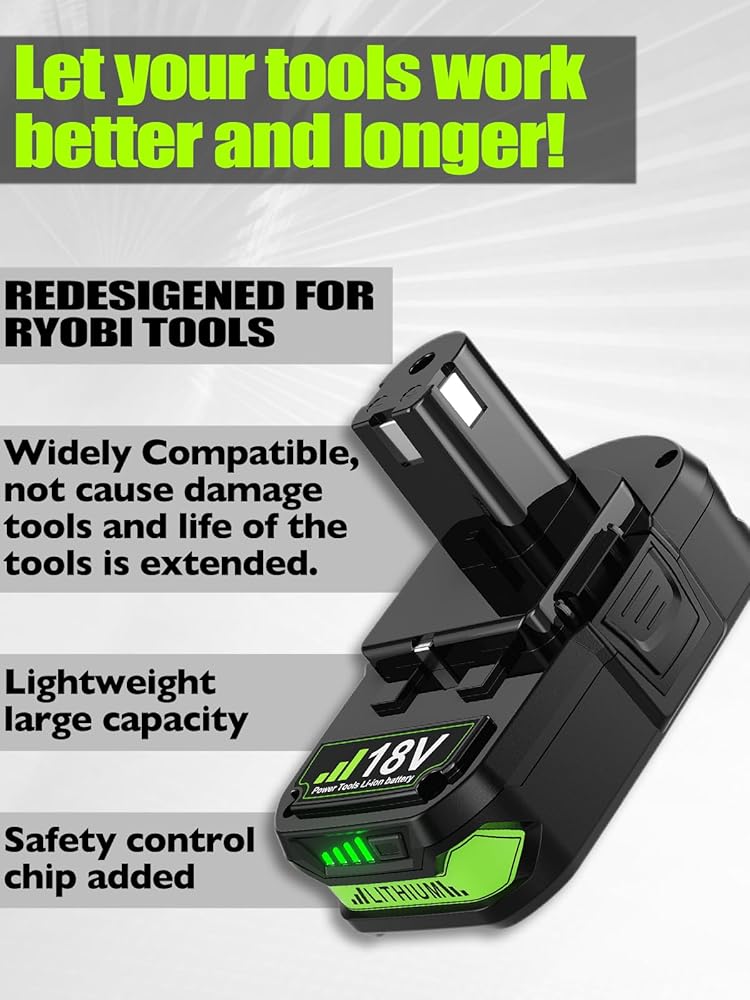 [REDESIGENED FOR RYOBI BATTERY] Compatible with the entire Line of ryobi 18V lithium Ion tools.Your old style ryobi 18V tools will also come back to life. According to ryobi original tools and batteries, we have re-customized the design to make its batteries more compatible with tools, and also protect your tools and provide a longer service life. Suitable for P102 P108 P104 P105 P103 P107 P109 cordless power tools.