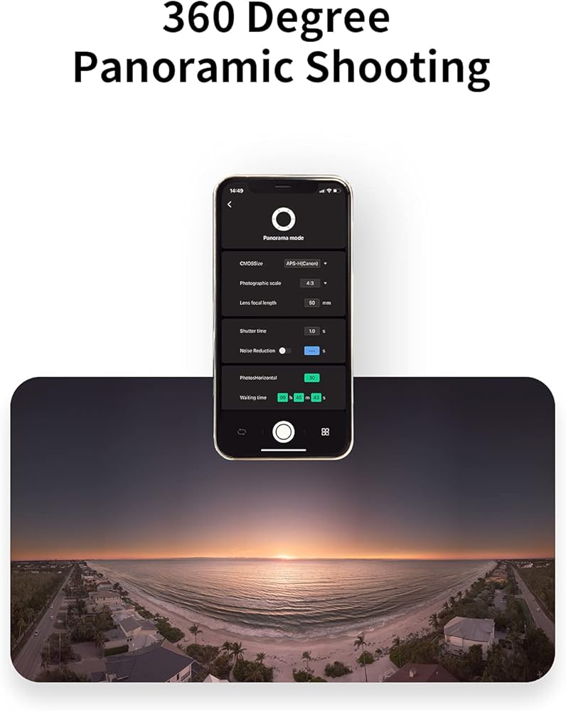 【360 Degree Panoramic Shooting】To unlock the 360 degree panoramic shooting, you just need to input the sensor size and focal length of the camera in the mobile APP - Zeapon Lab, and then the software can automatically calculate the number of shots taken in the horizontal direction. After you click the start button, the camera can start taking 360 degree panoramic photos.