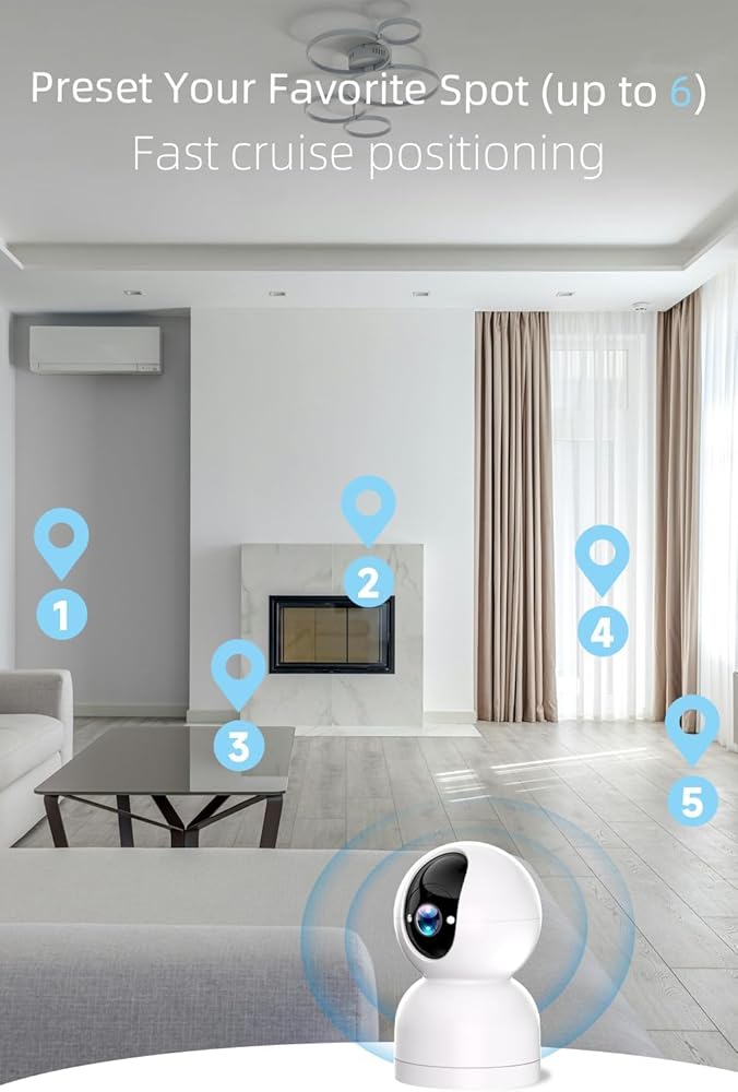 ◀360°Auto Rotation & 6 Preset Favorites Cruise▶ ●This ptz camera indoor can auto rotation with horizontal 355° and vertical 90°, helping you monitor every angle of any room, with no blind spot. You can preset your favorite spot (up to 6) for fast cruise positioning, which can provide you with a more flexible view for home security. (The wired indoor camera supports 2.4G/WIFI 6)