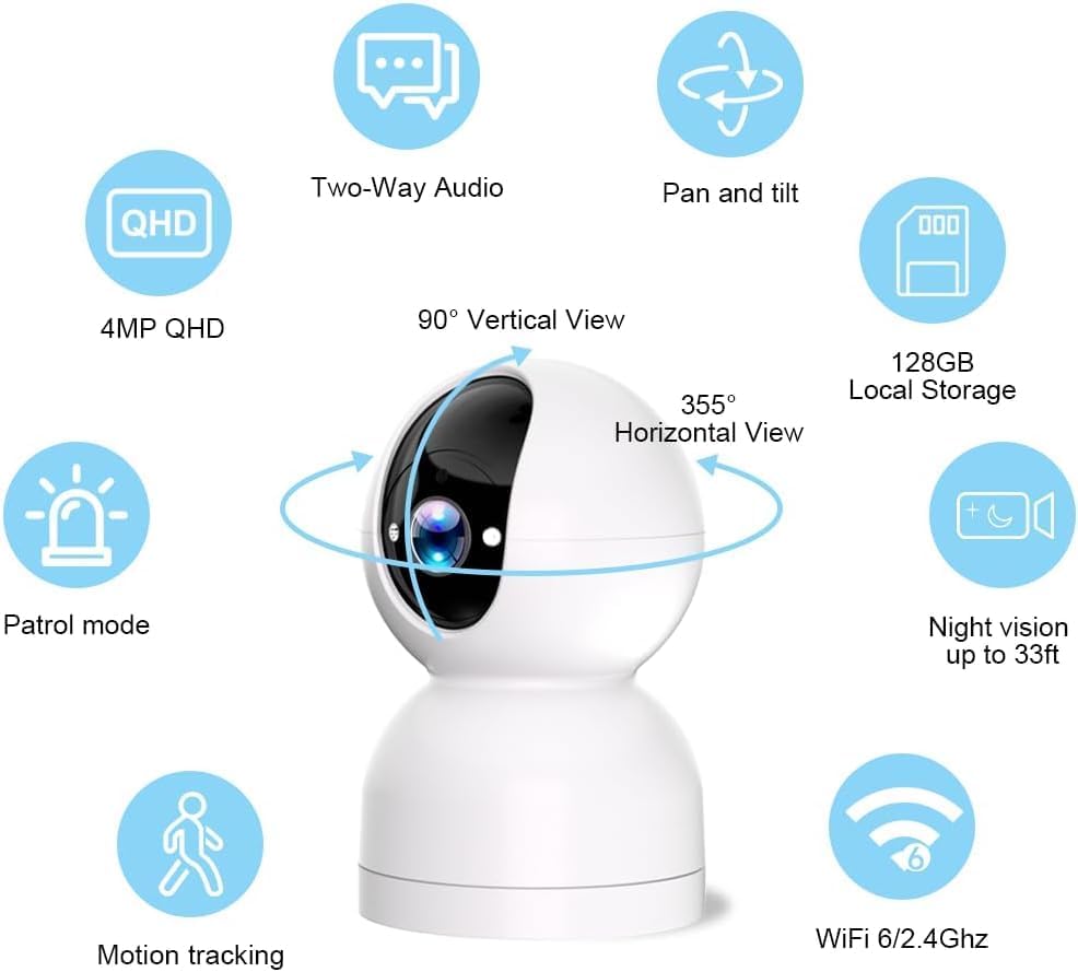 ◀2K Full HD & Color Night Vision▶ ●With 4MP full HD resolution, the camera for home security indoor displays a clear smooth live video, making sure you can accurately see what is happening at home. Furthermore, with optional color/smart/infrared night vision, the baby camera monitor captures clear night videos( up to 33ft), and can remotely monitor your baby's room in complete darkness