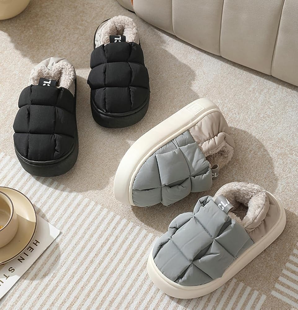 MATERIAL- Our fluffy slippers are made with waterproof nylonc and soft faux fur upper fabri to keep your feet warm but not sweaty. The house shoes also provides comfort and great arch support with reversible memory foam footbed.