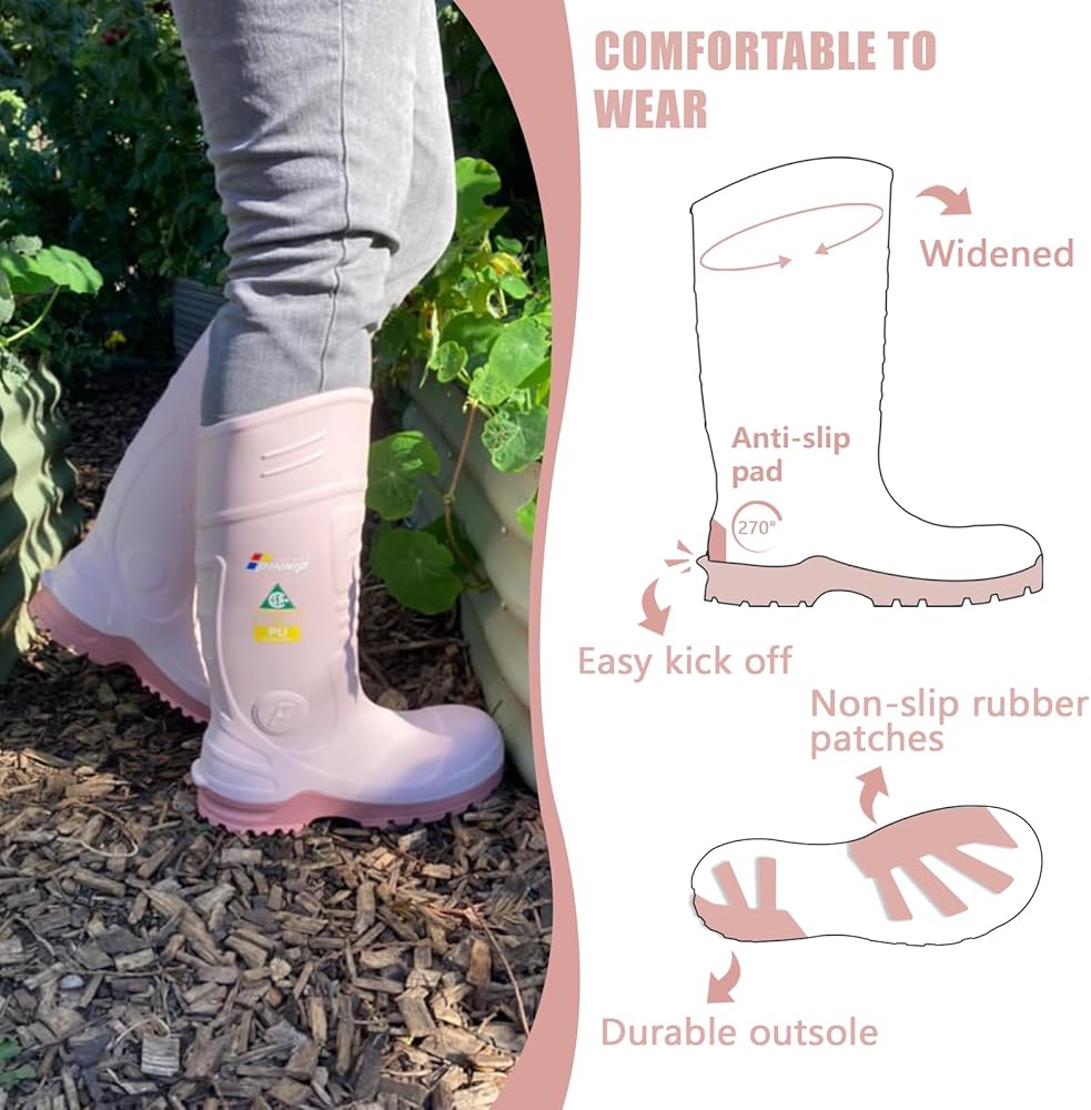 Safety PU Rubber Work Boots For Women: Designed with a steel toe cap to provide reliable protection against heavy objects and compression, meet ASTM F2413-18 standards, as well as the CSA-Z195 compliant puncture-resistant steel midsoles provide comprehensive protection for feet.