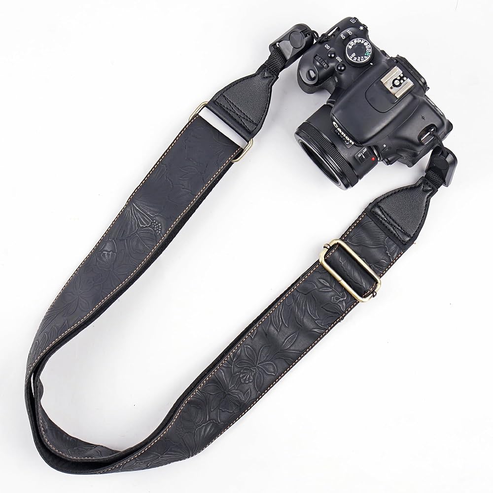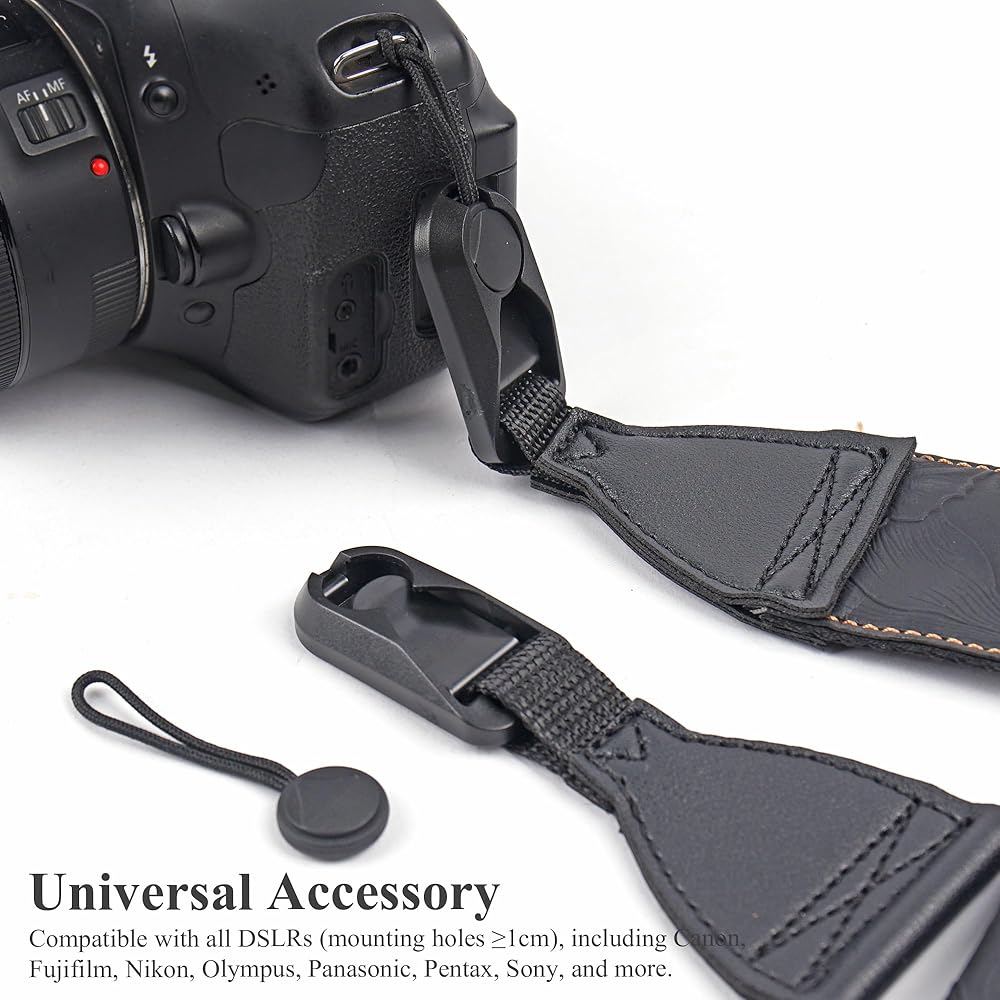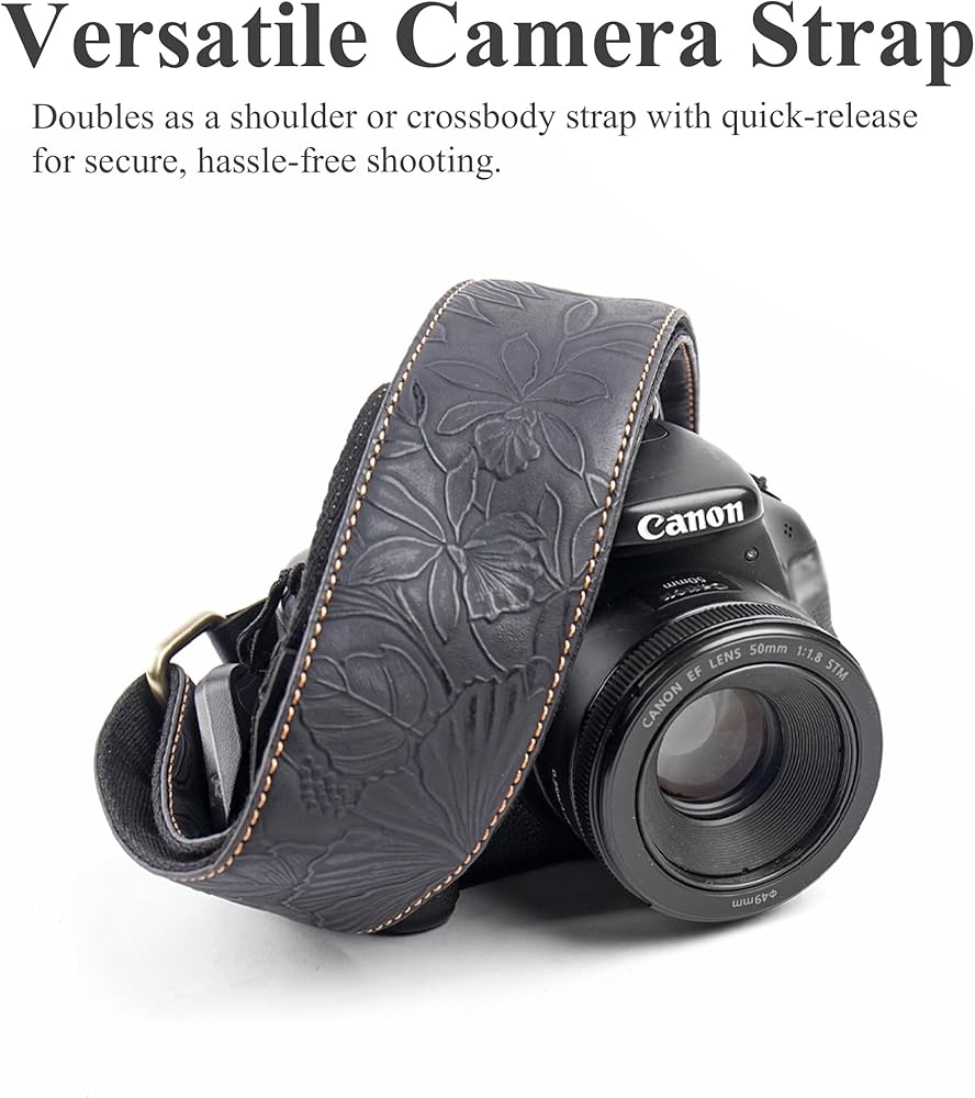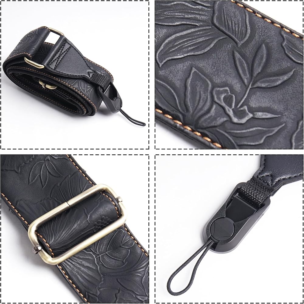 📷 FULLY ADJUSTABLE LEATHER CAMERA NECK BELT: Made of genuine and high-quality leather. Size: 41 to 52 inches long and one and a quarter-inch wide, You may adjust the length to make it a neck, crossbody, or shoulder strap for your camera.