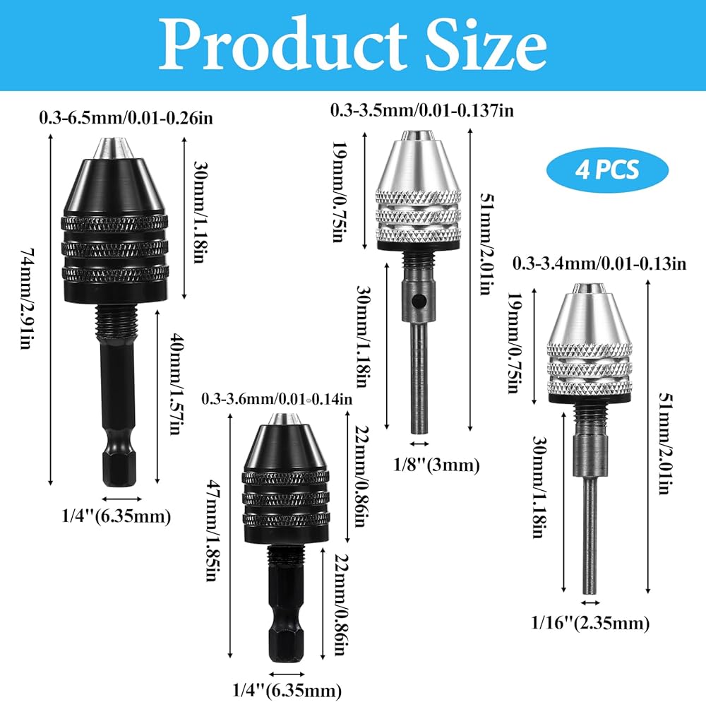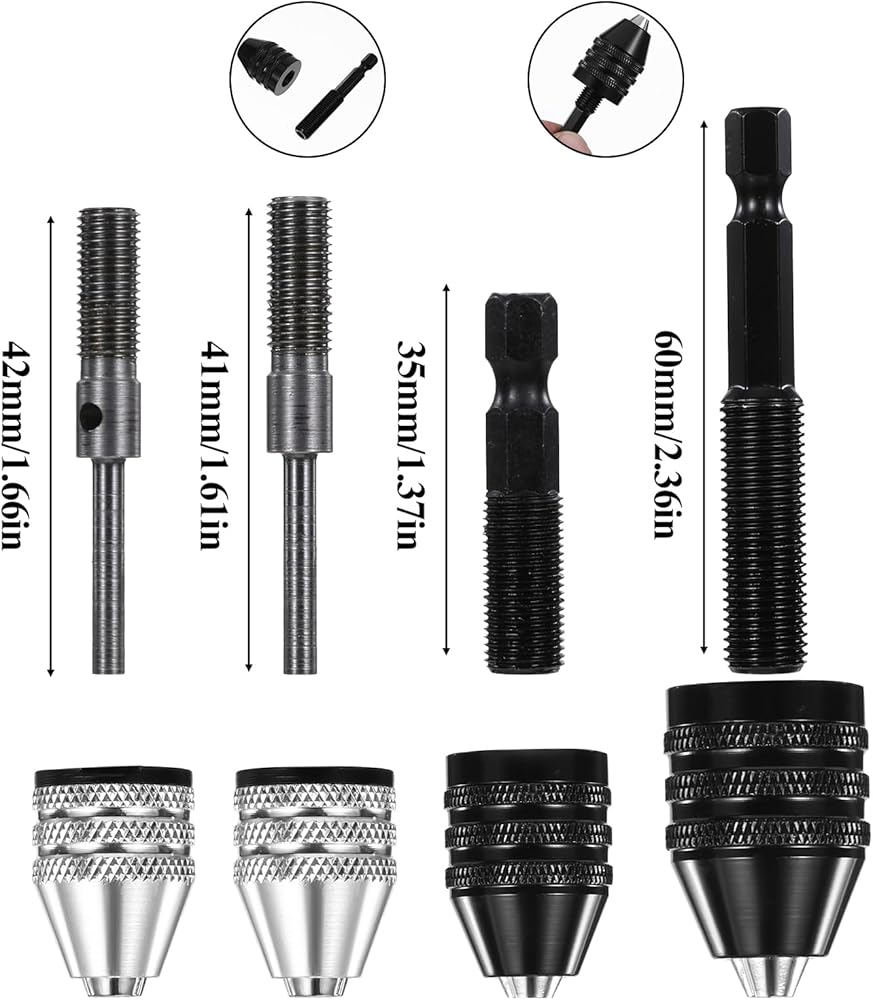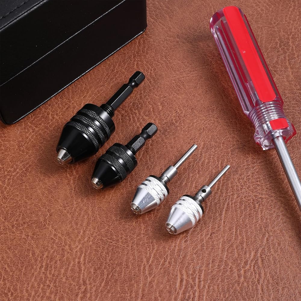 【Comprehensive Set】This drill chuck set includes 10 pieces, with various sizes and clamping ranges to suit all your drilling needs. The set includes 1/4 inch, 1/8 inch, and 1/16 inch keyless drill chucks, as well as a drill chuck adapter and drill bit adapter. With this comprehensive set, you'll always have the right tool for the job.