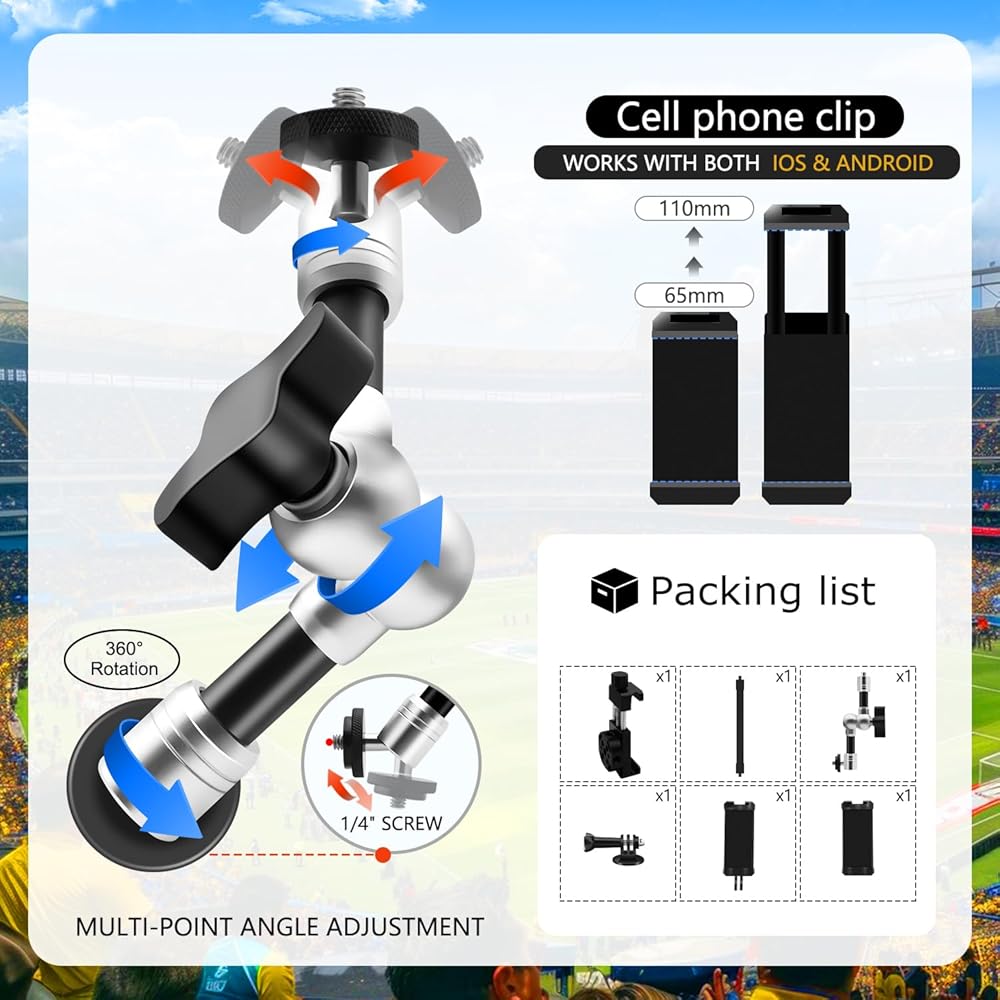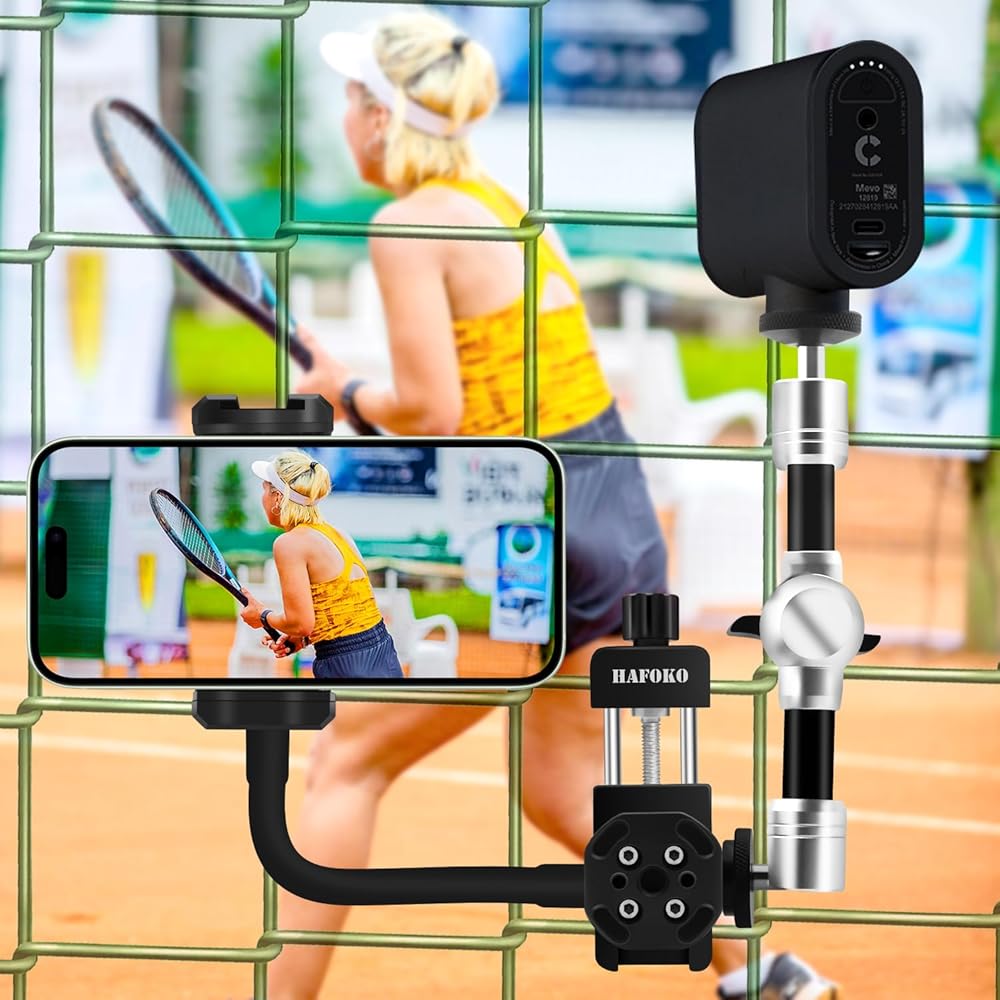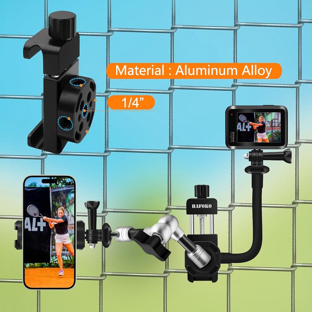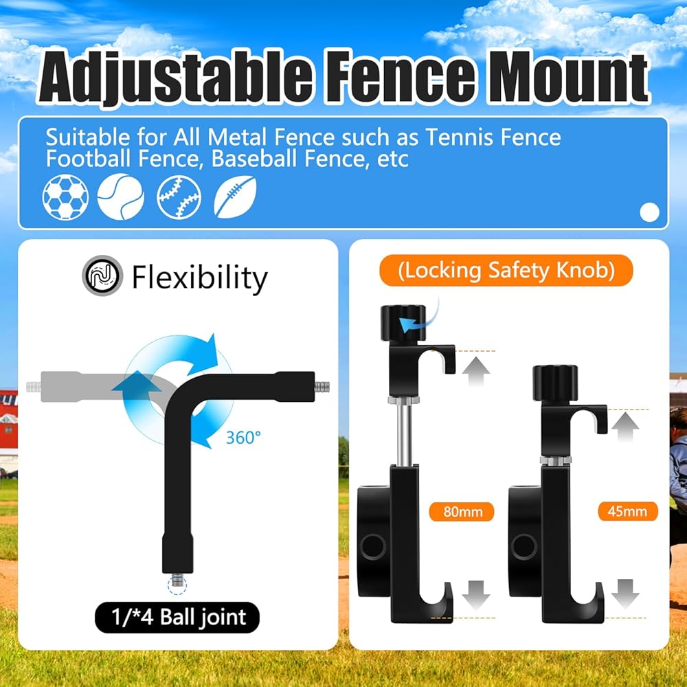 Sturdy Construction-The fence mount is made of high quality aluminum, adjustable clamping distance,clamps securely to the net, safe and strong, the metal magic arm is adjustable, you can choose any angel you like, the fence mount kit is also with a silicone magic arm which supports double devices you need at the same time