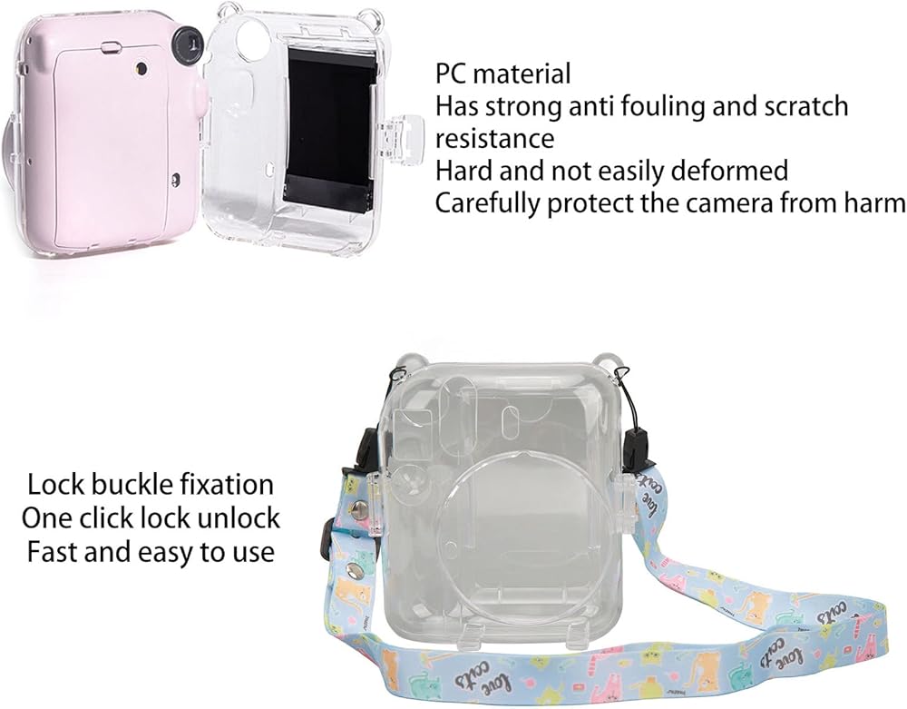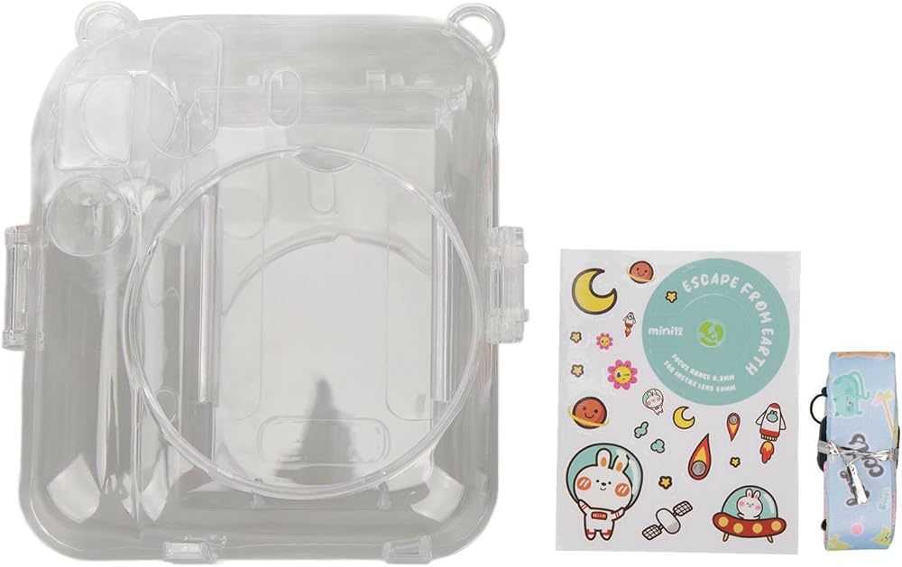 Product Design: The camera case has a comfortable touch and skin friendly; It adopts a 1:1 opening design, perfectly fitting and standing up for mini 12; This product is a transparent shell that can directly display the rich colors of the camera, and is paired with personalized colorful stickers to make it more beautiful.