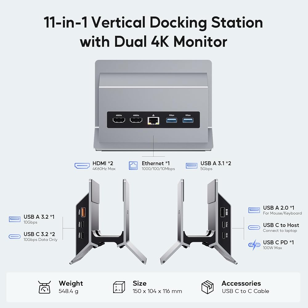 Laptop Docking Station Dual Monitor, 11 in 1 Vertical USB C Dock Stand with 2 HDMI 4K 60Hz, 3 USB A/C 10Gbps, 2 USBA 5Gbps, USB-A 2.0, Ethernet, PD 3.0 Docking Station for Type-C Laptops