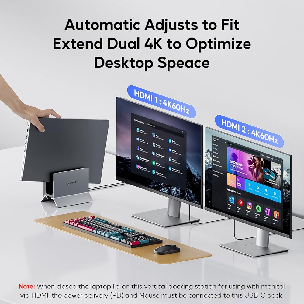 LAPTOP DOCKING STATION WITH COMPREHENSIVE CONNECTIVITY - PULWTOP laptop dock for dual displays features 2 HDMI 4K@60Hz, 2 USB C Gen2 10Gbps, USB A Gen2 10Gbps, 2 USB 3.0 5Gbps, RJ45 wired Gigabit Ethernet, USB A 2.0, USB-C PD100W and USB C to host port. Effortlessly supports 2 external monitors for full HD movies, games, office meetings, and entertainment, while providing enough ports for mouse, keyboard, and other most USB A/C peripherals. ★NOTEs: 1). PD power adapter is NOT included. 2). To ensure all functions work stably, please connect a PD power adapter greater than 65W to the "USB C-PD" port on the dock