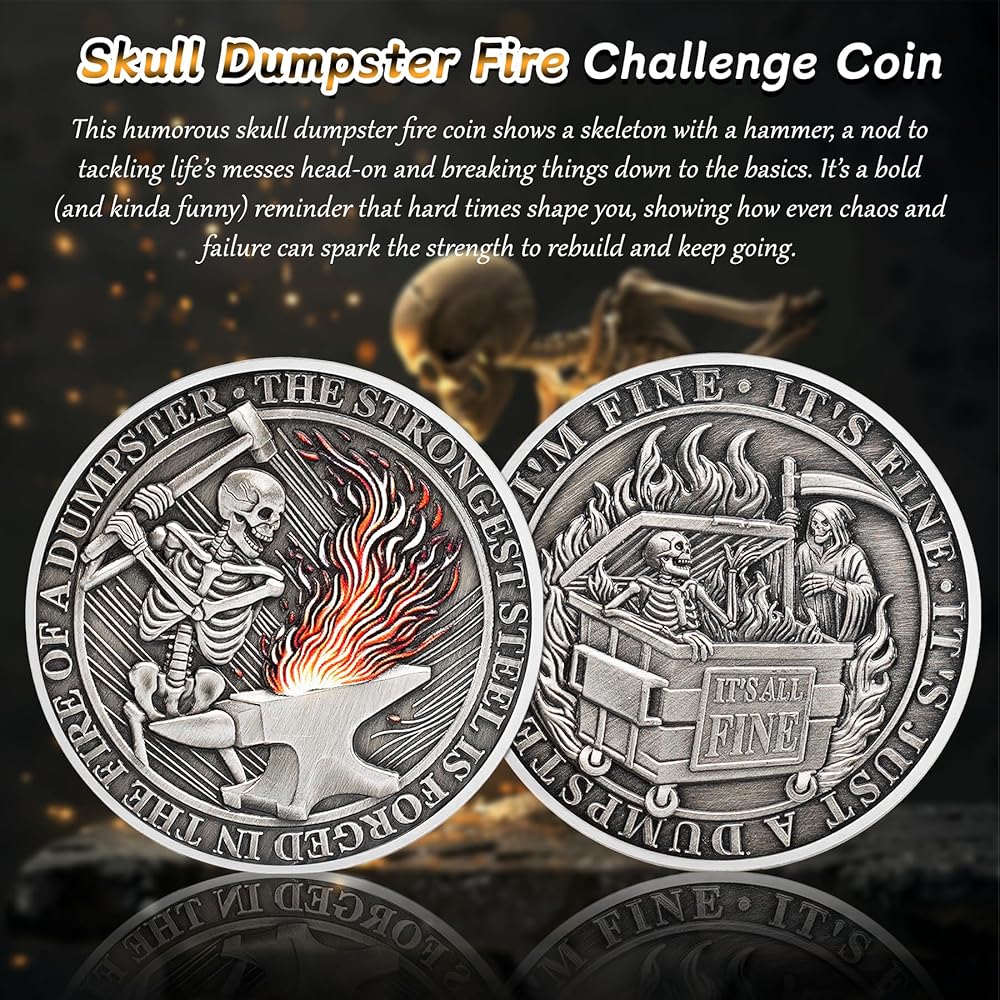 💀Dumpster Fire: This humorous skull dumpster fire coin shows a skeleton with a hammer, a nod to tackling life's messes head-on and breaking things down to the basics. It's a bold (and kinda funny) reminder that hard times shape you, showing how even chaos and failure can spark the strength to rebuild and keep going. The Dumpster fire medallion could add a touch of humor to the office, ensuring joy and resilience during the workday, and inspiring employees