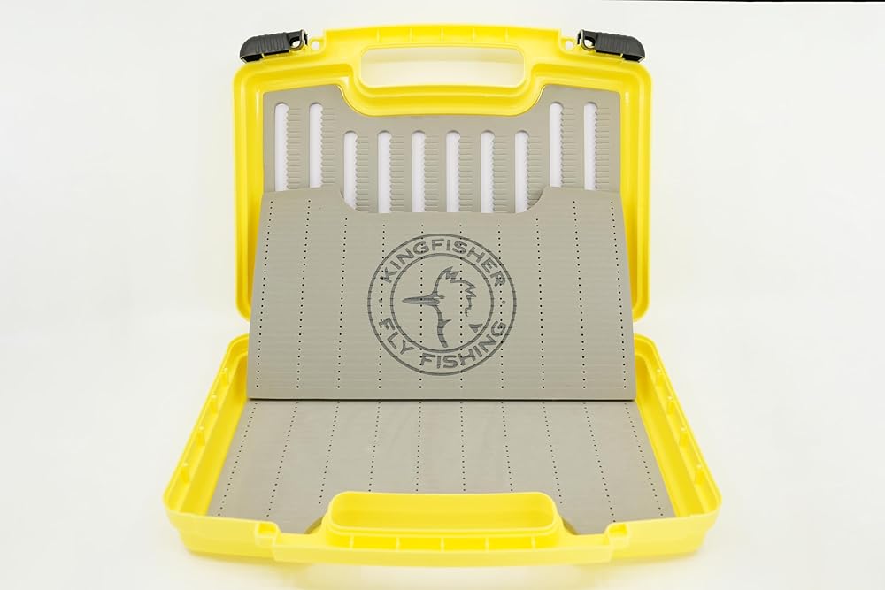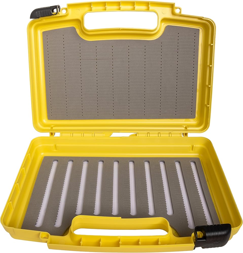 This durable fishing rod case is designed to keep your gear organized and protected on the go. Measuring 14" x 11" x 3.35" (35.6 cm x 27.9 cm x 8.5 cm), it features high-density foam that securely holds even the biggest hooks. The click lock handles ensure the box stays closed during transport. One of the standout features is the slotted foam internally on the top and bottom lid, as well as an external slotted foam sheet for easy drying, organizing, or quick access while behind the oars. The thick, durable foam includes fly placement guides to easily identify where the slots are located. Founded in 1997 by two fishing guides, this American, brick-and-mortar store takes pride in offering quality products for anglers. Whether you're heading out for a day on the river or a weekend fishing trip, this case is a must-have to keep your gear organized and protected.