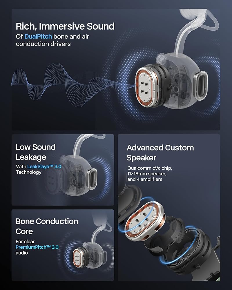 Clearer Calls - The dual noise-cancelling microphone system cuts 98.6% of background noise, while dual bone and air conduction drivers work with an advanced custom speaker to bring you immersive audio.