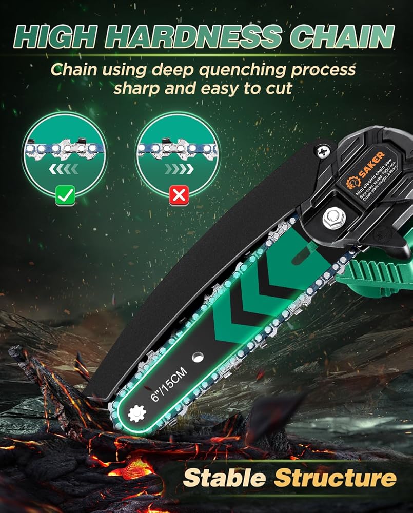 【LIGHTWEIGHT AND PORTABLE】 - Saker Mini Chainsaw weighs only 1.1 kg (including battery) and has a total length of 4 inches. Saker cordless mini chainsaw can be used with one hand, and it is not easy to get tired after long-term use. It is very suitable for family and temporary work, even the elderly can easily control it.