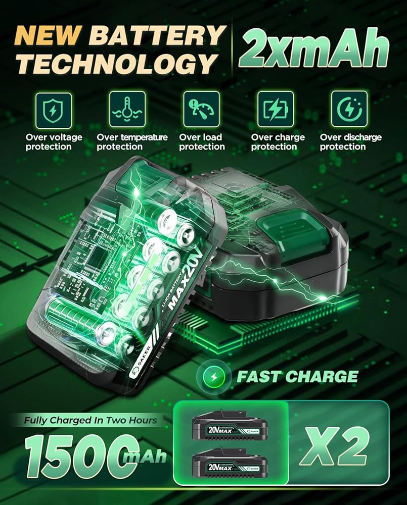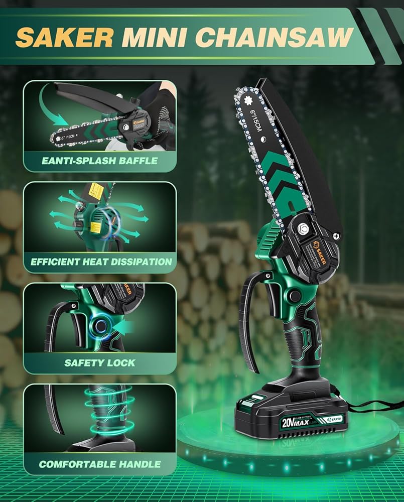 【RECHARGEABLE ELECTRIC CHAINSAW】 - The Saker mini electric chainsaw is equipped with a 20V 1500mAh rechargeable lithium battery, which can be used for a long time. Charging at any time, convenient and fast.If you do not use it for a long time, please remember to fully charge the battery first, for a better experience the next time you use it.