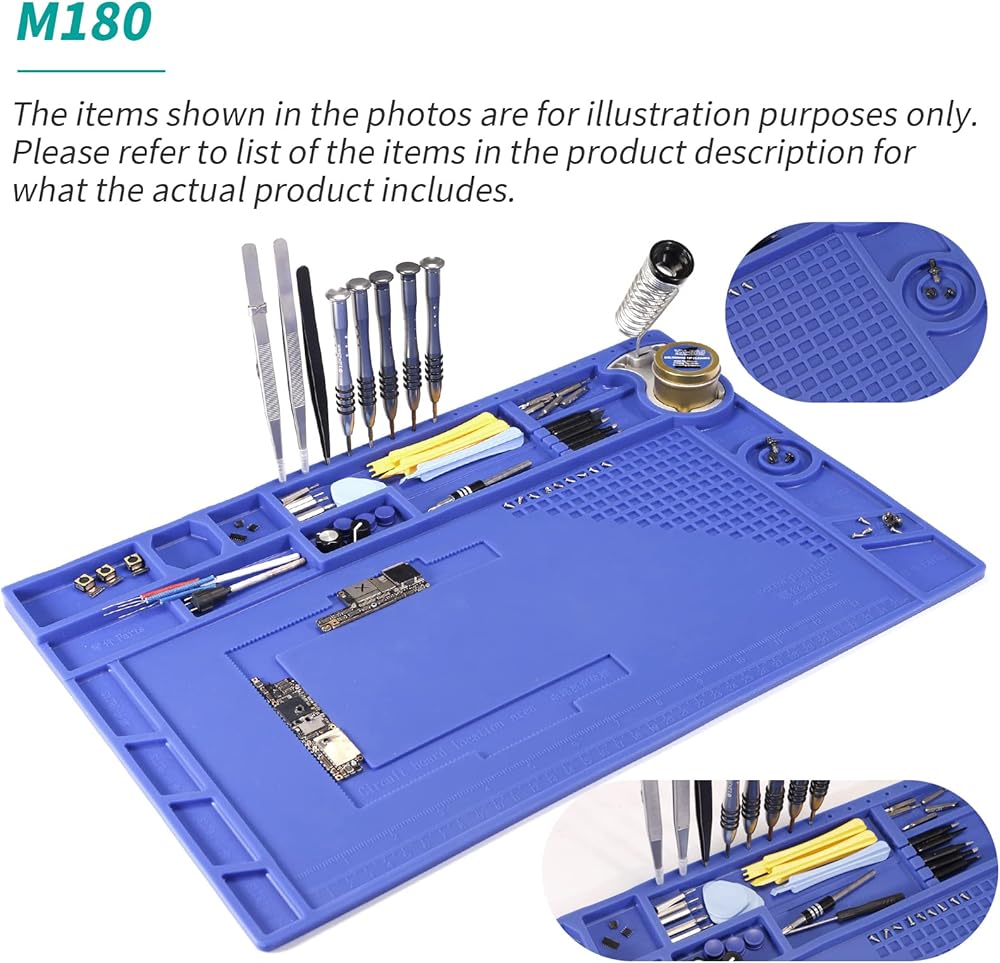 If you've had enough with leaving some burn marks on your beautiful workbench or even burning it crack, losing track of tiny important components or parts falling off the slippery table while soldering or disassembling electronics. Then a soldering work mat is a good solution. And things are just easier with a work mat like YIHUA M180. YIHUA M180 is more than just a protective silicone mat. It is so good-quality, feature-rich and useful that it can be essential for your soldering, repair, assembly or disassembly work. In the box: 1 x M180 Silicone Work Pad What makes it essential? Firstly, it is high heat resistant. It can withstand heat up to 932℉(500℃). Nothing will happen when you directly drop some molten solder on it. But that's not the case when you drop some on your workbench. And you can simply clean it with soap or water whenever you find it needs cleaning. Secondly, its anti-static design frees the components from troublesome static damage while non-slip design on both sides stops it from sliding around the desk and prevents components going astray. Thirdly, it comes with many classic and useful compartments in different sizes. Keep tools and parts in order and under control. a. 20 big, medium-sized and small-sized divisions help you retain different-sized tools and parts. b. Up to 122 numbered latticed positions make keeping track of tiny components as easy as pie. c. With a row of small openings on the side, have tools like screwdriver handy anytime.