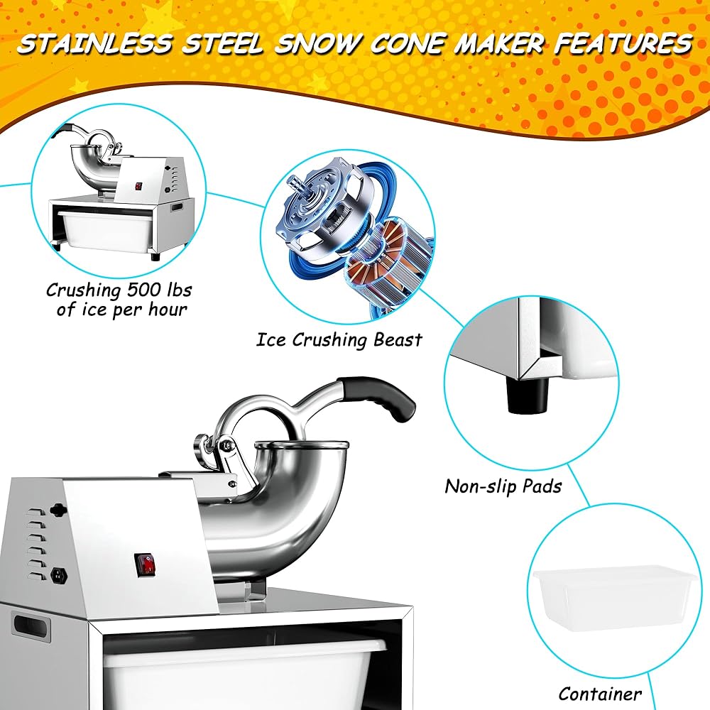 🧊Ice Crushing Beast: The powerful snow cone machine motor ensures a high speed of 1450 rpm and a crushing speed of about 500 pounds of ice per hour, easily meeting a large demand; the sharp and sturdy stainless steel blades and replacement blades allow you to use it with confidence without worrying about damage.