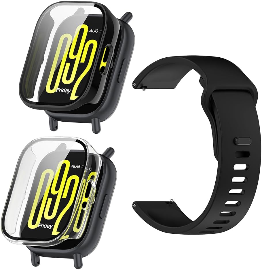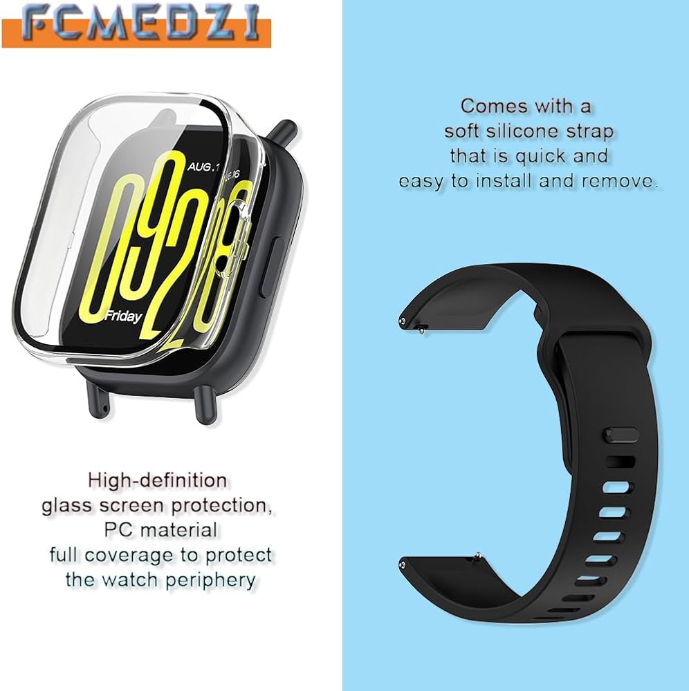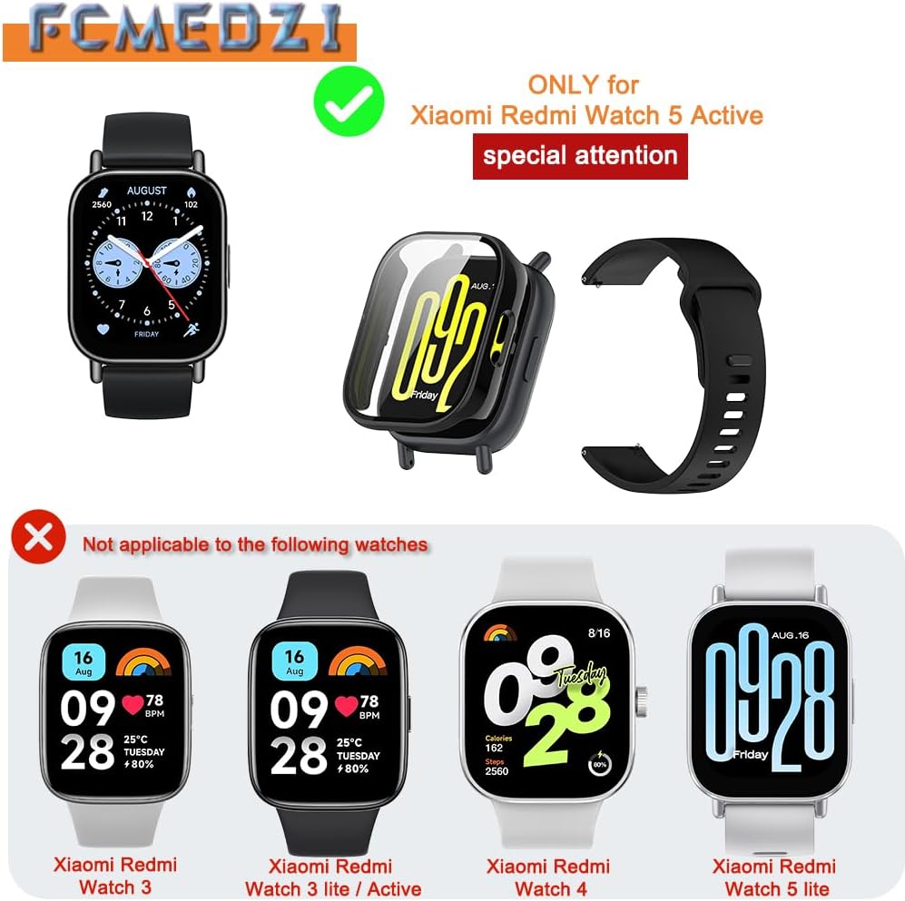 Item is compatible with Xiaomi Redmi Watch 5 watch with 2 x FCMEDZI HD clear PC+Glass full coverage cases (Electroplated black and clear), 1 x black silicone watch band, (Note: Please choose the corresponding Active or lite according to the watch model, the size of these two versions of the watch is not the same) Please check your watch model to make a purchase. Please check your watch model number to purchase.