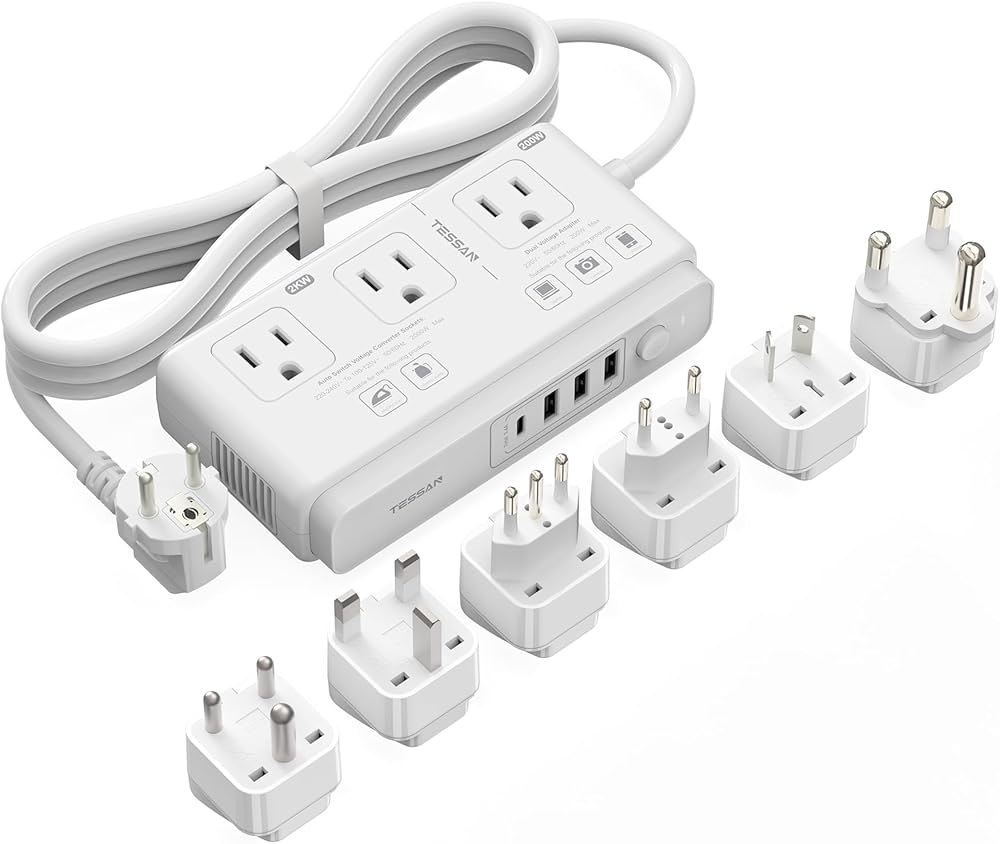 TESSAN 220V to 110V Voltage Converter for Travel 2000W, 3 AC Outlet with 4 USB Ports (1 USB C) and EU UK AU IT in ZA International Power Adapter, Step Down Transformer Outlet Converters