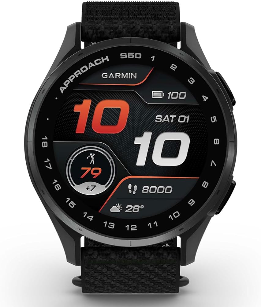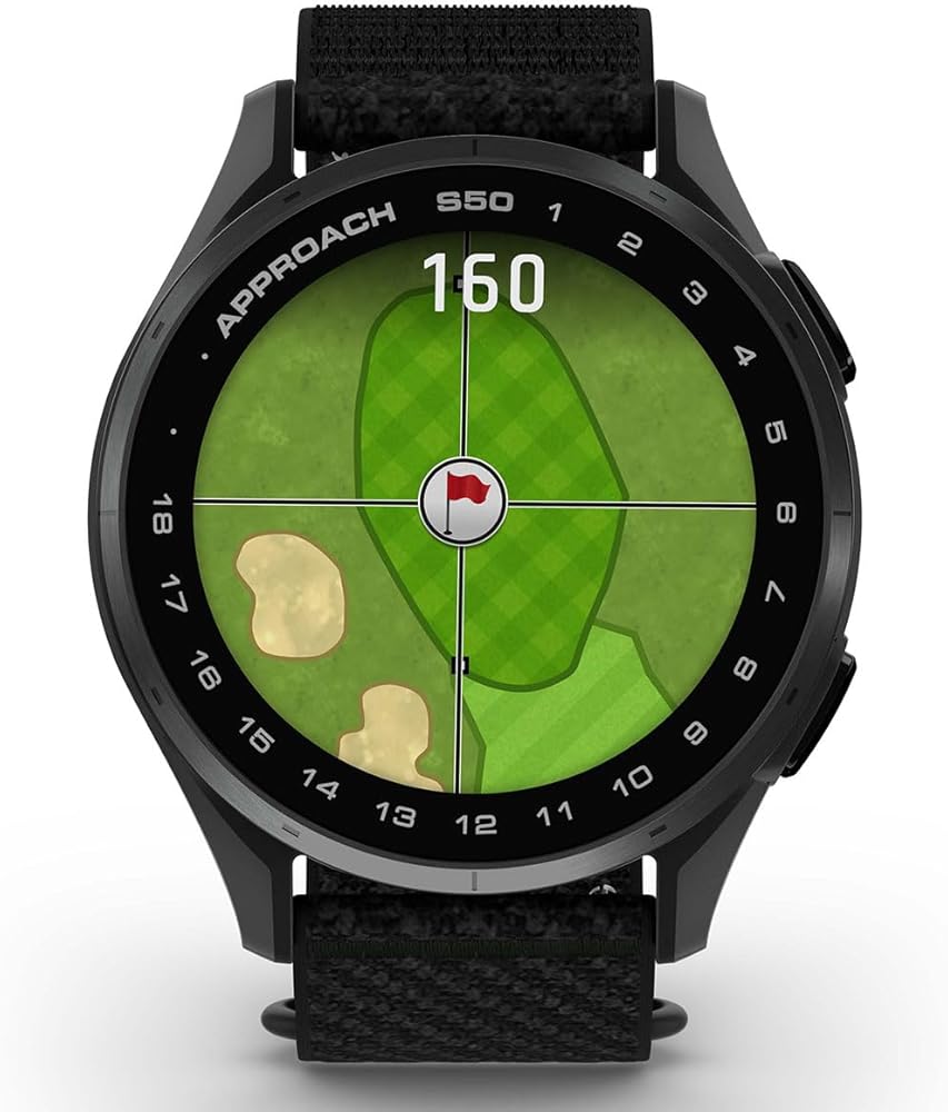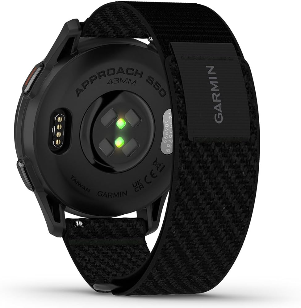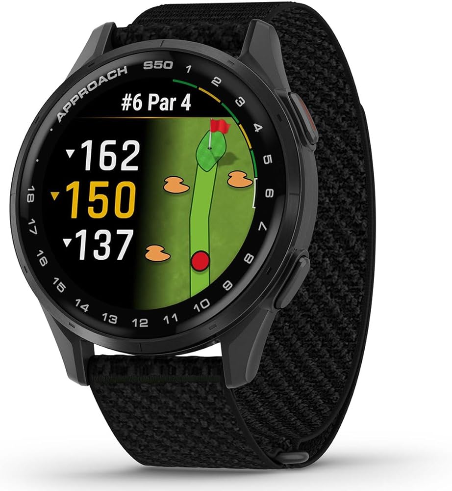 Step onto the course with total confidence wearing the Garmin Approach S50 Golf GPS Watch, the ultimate game-changing companion for golfers who demand accuracy, style, and cutting-edge technology. Designed for serious players, the 1.2” color AMOLED display brings 43,000+ preloaded courses to life with crisp, vibrant visuals, giving you precise yardages to the green, hazards, and doglegs at a glance. With PlaysLike Distance, elevation-adjusted yardages ensure you make smarter club selections every time, helping you play like a pro. The lightweight ComfortFit nylon strap ensures all-day comfort, making it just as stylish off the course as it is powerful on it. And with up to 10 days of battery life in smartwatch mode and 15 hours in GPS mode, you can go from early morning tee-offs to back-to-back rounds without stopping to charge. Enhance your game with Hazard View for strategic shot planning, PinPointer for blind shots, and optional Approach CT1 or CT10 club trackers for automated shot tracking. Plus, with activity profiles for strength, yoga, and cardio, you'll improve your flexibility and power, giving you the edge where it counts. Stay connected with Garmin Pay, music streaming, smart notifications, and the Garmin Golf app for score tracking and performance insights. Elevate your game and play every round like a champion with the Garmin Approach S50 Golf GPS Watch.