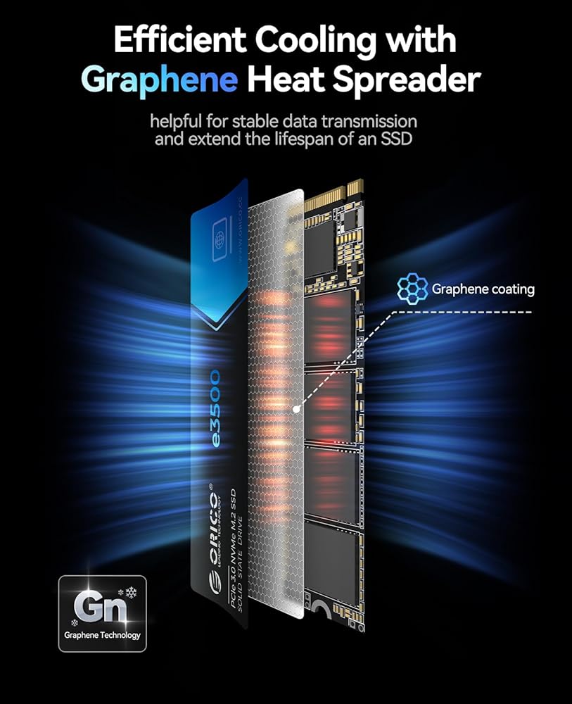 [Excellent Heat Dissipation] - Equipped with graphene heat spreader, the ORICO e7400 M.2 NVMe SSD effectively dissipates heat without increasing its volume. This protects its hardware from the risk of overheating damage, ensuring excellent performance and long lasting use