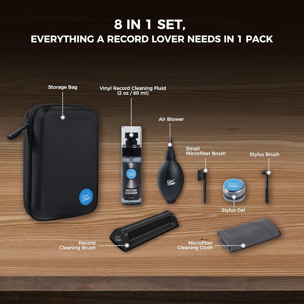 8 IN 1 KIT: 1 * velvet cleaning brush, 1 * microfiber brush, 0.21 oz turntable needle cleaning gel, 2.1 oz cleaning solution, 1 *mini microfiber brush, 1 *air blower, and 1 *microfiber cleaning cloth. Tools needed from cleaning to preserving to restoring included. Comes with a small storage case, easy to store and carry.