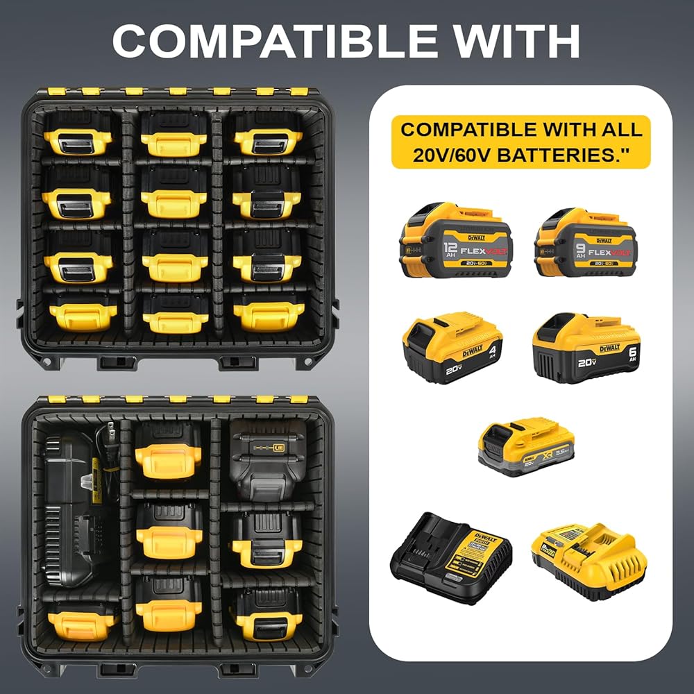 Versatile Compatibility: The Waterproof hard case Compatible with a wide range of tool battery brands and model ,universal compatible with dewalt 8v/12v/20v/60v - 2.0/3.0/4.0/5.0/6.0/9.0-Ah tool battery & chargers, Case for Milwaukee M18/M12- 2.0/3.0/4.0/5.0/6.0/9.0/12.0-Ah tool battery (𝐍𝐨𝐭 𝐟𝐨𝐫 𝐌𝐢𝐥𝐰𝐚𝐮𝐤𝐞𝐞 𝐜𝐡𝐚𝐫𝐠𝐞𝐫𝐬), Portable and compact, a great solution for storage, carry, or protecting tool battery.