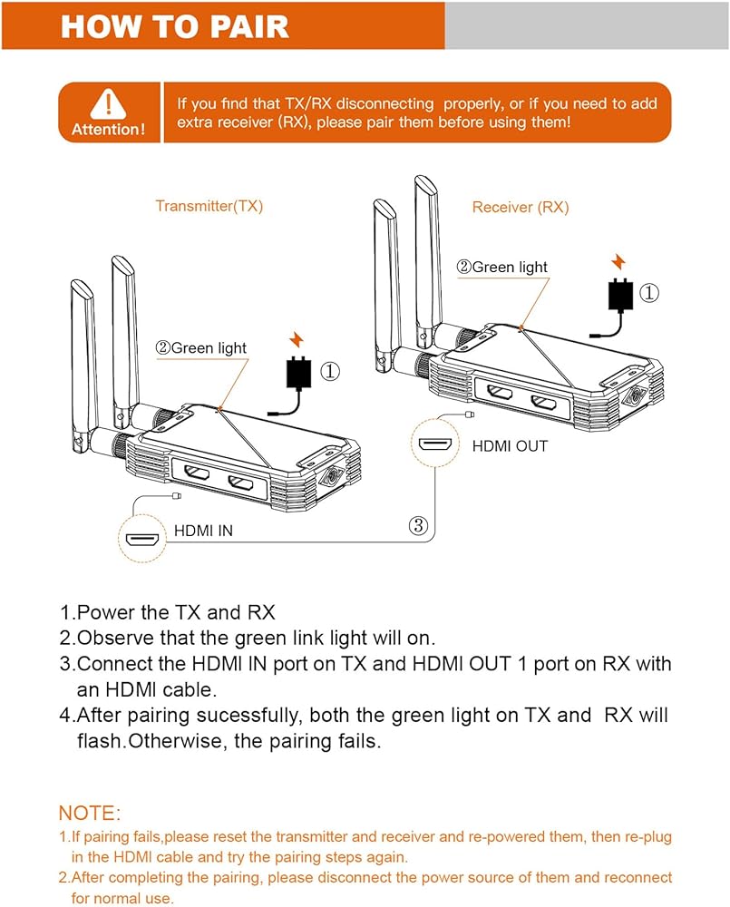 Transmission distance up to 1300FT:Dual antenna design, 2.4/ 5G high speed transmission, strong signal. Featuring WiFi transmission technology, wirelessly extends the 1080P Full HD HDMI signal up to 1300FT in an open field without interference through a point-to-point connection between the transmitter and receiver devices. Note: Metal, walls, bricks or glass can shorten signal coverage or cause severe signal loss