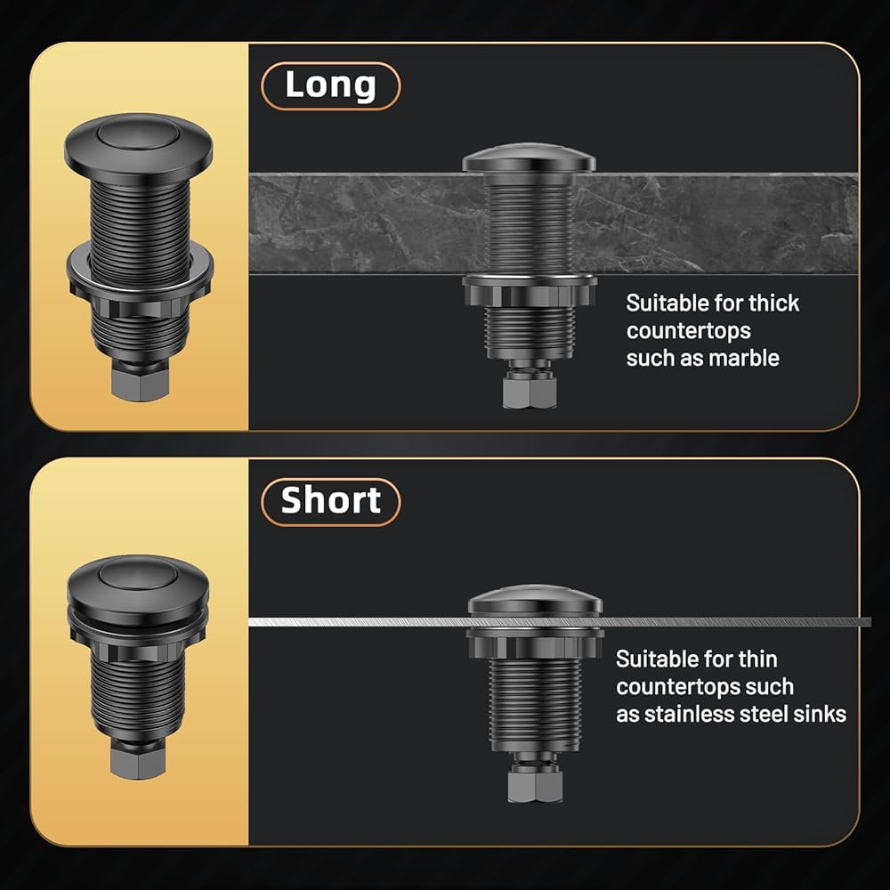 How to choose the button: To better match, in most cases, the LONG/3.6" is suitable for any thickness of countertops, such as granite, marble, quartz, and stainless steel sink countertops. The SHORT/2.9" is suitable for stainless steel sink countertops.